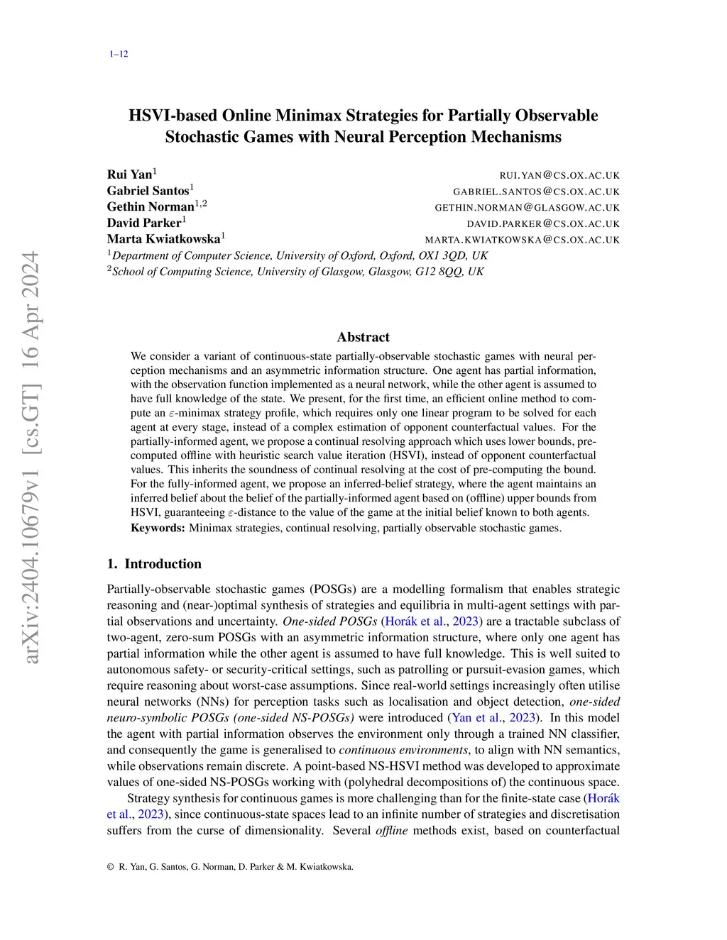 We consider a variant of continuous-state partially-observable stochastic games with neural perception mechanisms and an asymmetric information structure. One agent has partial information, with the observation function implemented as a neural network, while the other agent is assumed to have full knowledge of the state. We present, for the first time, an efficient online method to compute an -minimax strategy profile, which requires only one linear program to be solved for each agent at every stage, instead of a complex estimation of opponent counterfactual values. For the partially-informed agent, we propose a continual resolving approach which uses lower bounds, pre-computed offline with heuristic search value iteration (HSVI), instead of opponent counterfactual values. This inherits the soundness of continual resolving at the cost of pre-computing the bound. For the fully-informed agent, we propose an inferred-belief strategy, where the agent maintains an inferred belief about the belief of the partially-informed agent based on (offline) upper bounds from HSVI, guaranteeing -distance to the value of the game at the initial belief known to both agents.