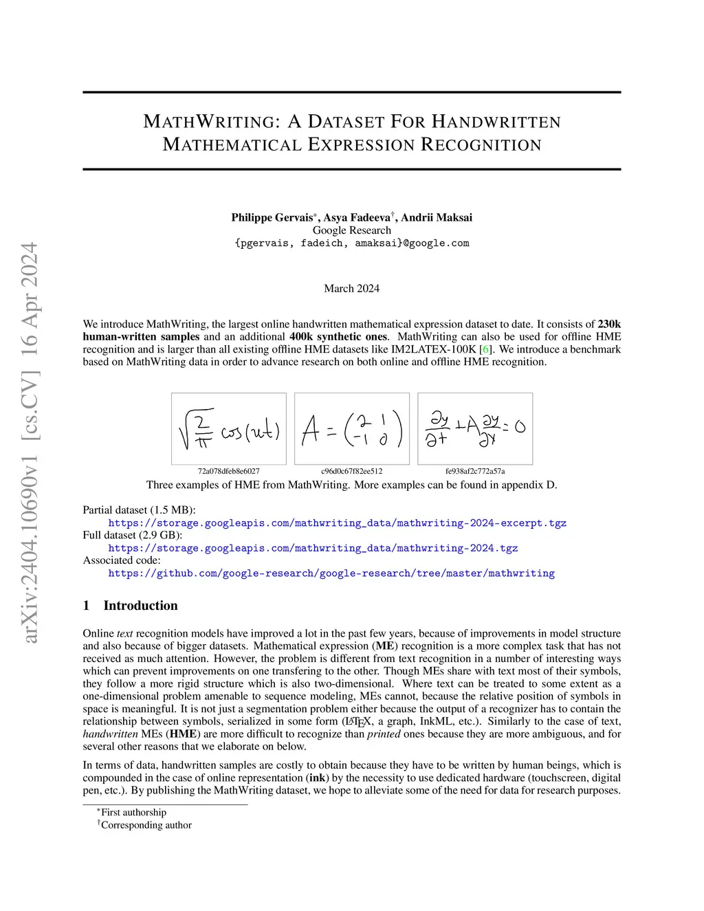Recognition of handwritten mathematical expressions allows to transfer scientific notes into their digital form. It facilitates the sharing, searching, and preservation of scientific information. We introduce MathWriting, the largest online handwritten mathematical expression dataset to date. It consists of 230k human-written samples and an additional 400k synthetic ones}. This dataset can also be used in its rendered form for offline HME recognition. One MathWriting sample consists of a formula written on a touch screen and a corresponding LaTeX expression. We also provide a normalized version of LaTeX expression to simplify the recognition task and enhance the result quality. We provide baseline performance of standard models like OCR and CTC Transformer as well as Vision-Language Models like PaLI on the dataset. The dataset together with an example colab is accessible on Github.