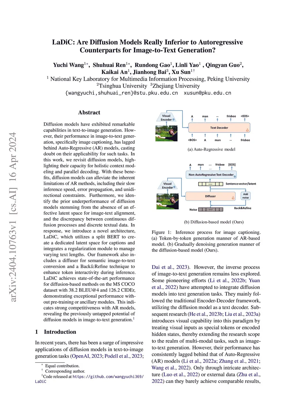 Diffusion models have exhibited remarkable capabilities in text-to-image generation. However, their performance in image-to-text generation, specifically image captioning, has lagged behind Auto-Regressive (AR) models, casting doubt on their applicability for such tasks. In this work, we revisit diffusion models, highlighting their capacity for holistic context modeling and parallel decoding. With these benefits, diffusion models can alleviate the inherent limitations of AR methods, including their slow inference speed, error propagation, and unidirectional constraints. Furthermore, we identify the prior underperformance of diffusion models stemming from the absence of an effective latent space for image-text alignment, and the discrepancy between continuous diffusion processes and discrete textual data. In response, we introduce a novel architecture, LaDiC, which utilizes a split BERT to create a dedicated latent space for captions and integrates a regularization module to manage varying text lengths. Our framework also includes a diffuser for semantic image-to-text conversion and a Back&Refine technique to enhance token interactivity during inference. LaDiC achieves state-of-the-art performance for diffusion-based methods on the MS COCO dataset with 38.2 BLEU@4 and 126.2 CIDEr, demonstrating exceptional performance without pre-training or ancillary modules. This indicates strong competitiveness with AR models, revealing the previously untapped potential of diffusion models in image-to-text generation.