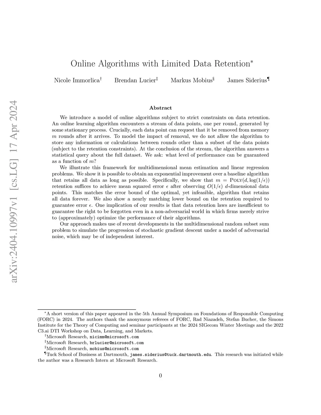 We introduce a model of online algorithms subject to strict constraints on data retention. An online learning algorithm encounters a stream of data points, one per round, generated by some stationary process. Crucially, each data point can request that it be removed from memory rounds after it arrives. To model the impact of removal, we do not allow the algorithm to store any information or calculations between rounds other than a subset of the data points (subject to the retention constraints). At the conclusion of the stream, the algorithm answers a statistical query about the full dataset. We ask: what level of performance can be guaranteed as a function of ? We illustrate this framework for multidimensional mean estimation and linear regression problems. We show it is possible to obtain an exponential improvement over a baseline algorithm that retains all data as long as possible. Specifically, we show that retention suffices to achieve mean squared error after observing -dimensional data points. This matches the error bound of the optimal, yet infeasible, algorithm that retains all data forever. We also show a nearly matching lower bound on the retention required to guarantee error . One implication of our results is that data retention laws are insufficient to guarantee the right to be forgotten even in a non-adversarial world in which firms merely strive to (approximately) optimize the performance of their algorithms. Our approach makes use of recent developments in the multidimensional random subset sum problem to simulate the progression of stochastic gradient descent under a model of adversarial noise, which may be of independent interest.