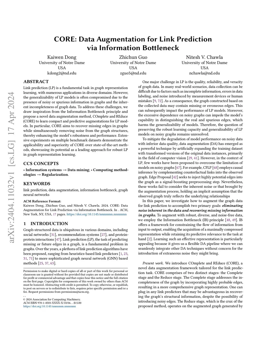 CORE: Data Augmentation for Link Prediction via Information Bottleneck