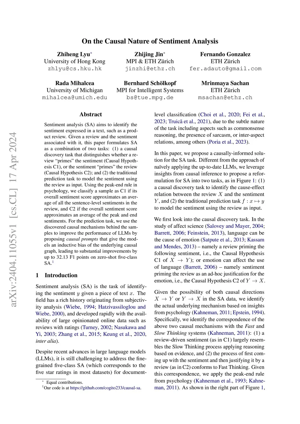 Sentiment analysis (SA) aims to identify the sentiment expressed in a text, such as a product review. Given a review and the sentiment associated with it, this paper formulates SA as a combination of two tasks: (1) a causal discovery task that distinguishes whether a review "primes" the sentiment (Causal Hypothesis C1), or the sentiment "primes" the review (Causal Hypothesis C2); and (2) the traditional prediction task to model the sentiment using the review as input. Using the peak-end rule in psychology, we classify a sample as C1 if its overall sentiment score approximates an average of all the sentence-level sentiments in the review, and C2 if the overall sentiment score approximates an average of the peak and end sentiments. For the prediction task, we use the discovered causal mechanisms behind the samples to improve the performance of LLMs by proposing causal prompts that give the models an inductive bias of the underlying causal graph, leading to substantial improvements by up to 32.13 F1 points on zero-shot five-class SA. Our code is at https://github.com/cogito233/causal-sa
