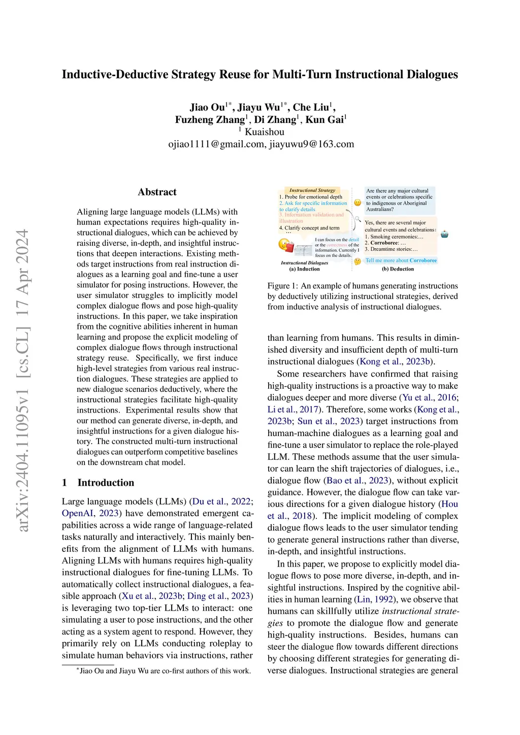Aligning large language models (LLMs) with human expectations requires high-quality instructional dialogues, which can be achieved by raising diverse, in-depth, and insightful instructions that deepen interactions. Existing methods target instructions from real instruction dialogues as a learning goal and fine-tune a user simulator for posing instructions. However, the user simulator struggles to implicitly model complex dialogue flows and pose high-quality instructions. In this paper, we take inspiration from the cognitive abilities inherent in human learning and propose the explicit modeling of complex dialogue flows through instructional strategy reuse. Specifically, we first induce high-level strategies from various real instruction dialogues. These strategies are applied to new dialogue scenarios deductively, where the instructional strategies facilitate high-quality instructions. Experimental results show that our method can generate diverse, in-depth, and insightful instructions for a given dialogue history. The constructed multi-turn instructional dialogues can outperform competitive baselines on the downstream chat model.