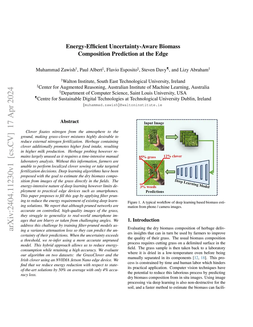 Clover fixates nitrogen from the atmosphere to the ground, making grass-clover mixtures highly desirable to reduce external nitrogen fertilization. Herbage containing clover additionally promotes higher food intake, resulting in higher milk production. Herbage probing however remains largely unused as it requires a time-intensive manual laboratory analysis. Without this information, farmers are unable to perform localized clover sowing or take targeted fertilization decisions. Deep learning algorithms have been proposed with the goal to estimate the dry biomass composition from images of the grass directly in the fields. The energy-intensive nature of deep learning however limits deployment to practical edge devices such as smartphones. This paper proposes to fill this gap by applying filter pruning to reduce the energy requirement of existing deep learning solutions. We report that although pruned networks are accurate on controlled, high-quality images of the grass, they struggle to generalize to real-world smartphone images that are blurry or taken from challenging angles. We address this challenge by training filter-pruned models using a variance attenuation loss so they can predict the uncertainty of their predictions. When the uncertainty exceeds a threshold, we re-infer using a more accurate unpruned model. This hybrid approach allows us to reduce energy consumption while retaining a high accuracy. We evaluate our algorithm on two datasets: the GrassClover and the Irish clover using an NVIDIA Jetson Nano edge device. We find that we reduce energy reduction with respect to state-of-the-art solutions by 50% on average with only 4% accuracy loss.