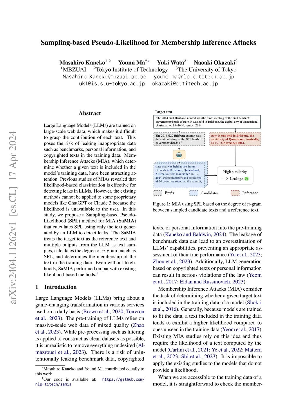 Large Language Models (LLMs) are trained on large-scale web data, which makes it difficult to grasp the contribution of each text. This poses the risk of leaking inappropriate data such as benchmarks, personal information, and copyrighted texts in the training data. Membership Inference Attacks (MIA), which determine whether a given text is included in the model's training data, have been attracting attention. Previous studies of MIAs revealed that likelihood-based classification is effective for detecting leaks in LLMs. However, the existing methods cannot be applied to some proprietary models like ChatGPT or Claude 3 because the likelihood is unavailable to the user. In this study, we propose a Sampling-based Pseudo-Likelihood (\textbf{SPL}) method for MIA (\textbf{SaMIA}) that calculates SPL using only the text generated by an LLM to detect leaks. The SaMIA treats the target text as the reference text and multiple outputs from the LLM as text samples, calculates the degree of -gram match as SPL, and determines the membership of the text in the training data. Even without likelihoods, SaMIA performed on par with existing likelihood-based methods.