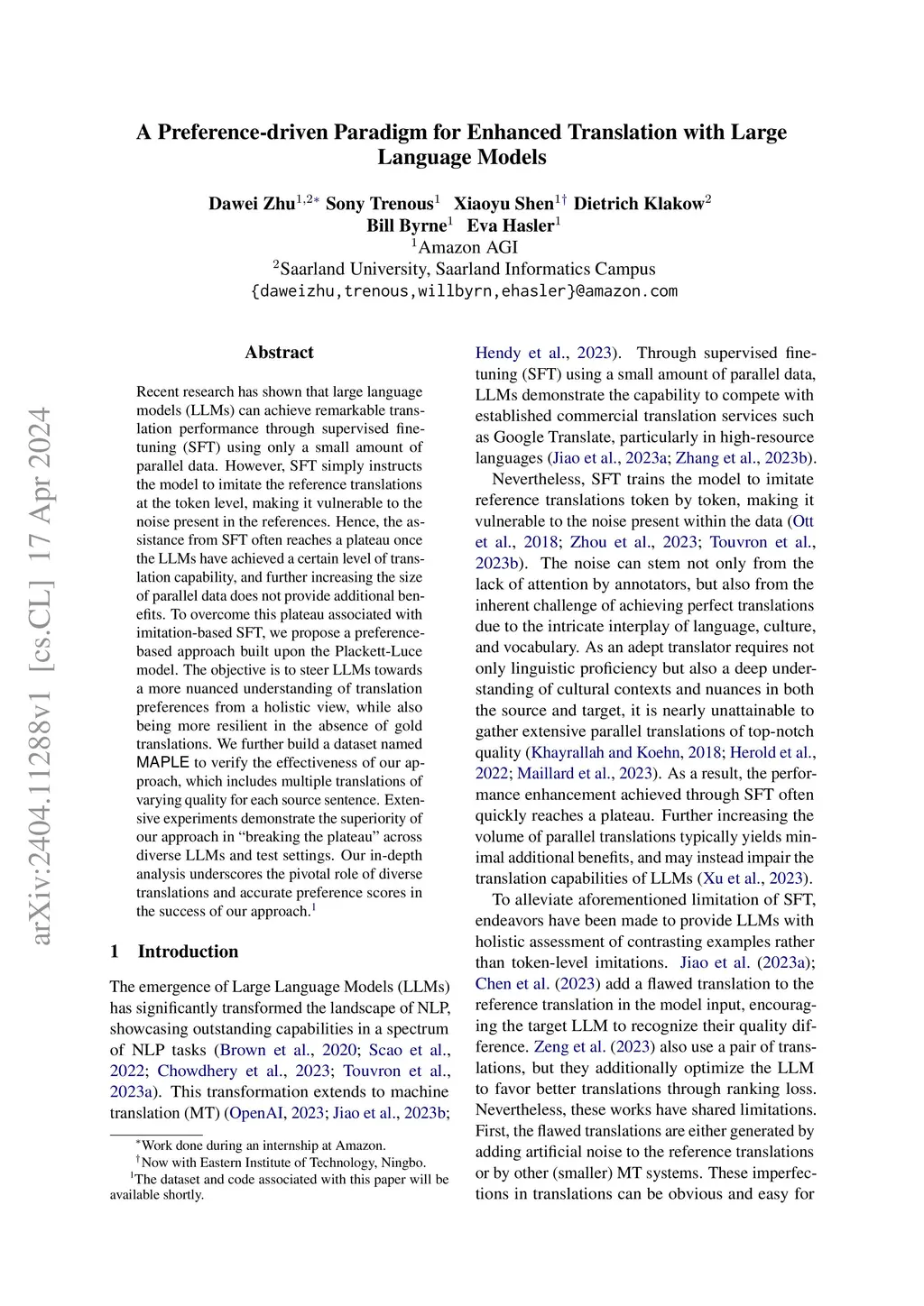 Recent research has shown that large language models (LLMs) can achieve remarkable translation performance through supervised fine-tuning (SFT) using only a small amount of parallel data. However, SFT simply instructs the model to imitate the reference translations at the token level, making it vulnerable to the noise present in the references. Hence, the assistance from SFT often reaches a plateau once the LLMs have achieved a certain level of translation capability, and further increasing the size of parallel data does not provide additional benefits. To overcome this plateau associated with imitation-based SFT, we propose a preference-based approach built upon the Plackett-Luce model. The objective is to steer LLMs towards a more nuanced understanding of translation preferences from a holistic view, while also being more resilient in the absence of gold translations. We further build a dataset named MAPLE to verify the effectiveness of our approach, which includes multiple translations of varying quality for each source sentence. Extensive experiments demonstrate the superiority of our approach in "breaking the plateau" across diverse LLMs and test settings. Our in-depth analysis underscores the pivotal role of diverse translations and accurate preference scores in the success of our approach.