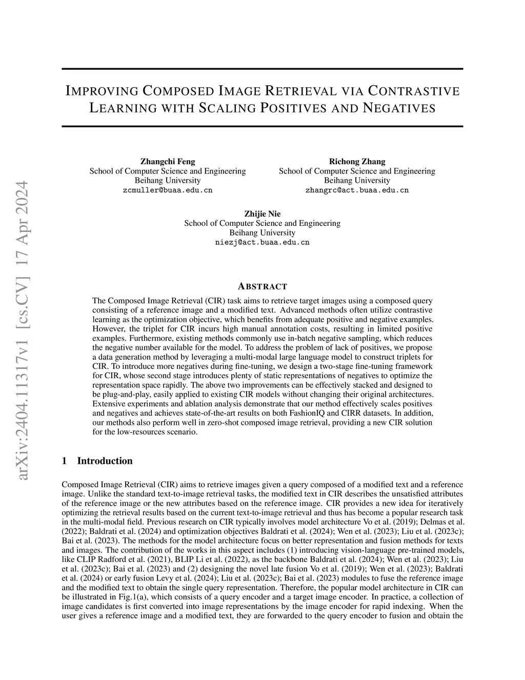 The Composed Image Retrieval (CIR) task aims to retrieve target images using a composed query consisting of a reference image and a modified text. Advanced methods often utilize contrastive learning as the optimization objective, which benefits from adequate positive and negative examples. However, the triplet for CIR incurs high manual annotation costs, resulting in limited positive examples. Furthermore, existing methods commonly use in-batch negative sampling, which reduces the negative number available for the model. To address the problem of lack of positives, we propose a data generation method by leveraging a multi-modal large language model to construct triplets for CIR. To introduce more negatives during fine-tuning, we design a two-stage fine-tuning framework for CIR, whose second stage introduces plenty of static representations of negatives to optimize the representation space rapidly. The above two improvements can be effectively stacked and designed to be plug-and-play, easily applied to existing CIR models without changing their original architectures. Extensive experiments and ablation analysis demonstrate that our method effectively scales positives and negatives and achieves state-of-the-art results on both FashionIQ and CIRR datasets. In addition, our methods also perform well in zero-shot composed image retrieval, providing a new CIR solution for the low-resources scenario.