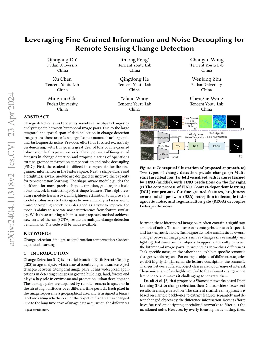 Change detection aims to identify remote sense object changes by analyzing data between bitemporal image pairs. Due to the large temporal and spatial span of data collection in change detection image pairs, there are often a significant amount of task-specific and task-agnostic noise. Previous effort has focused excessively on denoising, with this goes a great deal of loss of fine-grained information. In this paper, we revisit the importance of fine-grained features in change detection and propose a series of operations for fine-grained information compensation and noise decoupling (FINO). First, the context is utilized to compensate for the fine-grained information in the feature space. Next, a shape-aware and a brightness-aware module are designed to improve the capacity for representation learning. The shape-aware module guides the backbone for more precise shape estimation, guiding the backbone network in extracting object shape features. The brightness-aware module learns a overall brightness estimation to improve the model's robustness to task-agnostic noise. Finally, a task-specific noise decoupling structure is designed as a way to improve the model's ability to separate noise interference from feature similarity. With these training schemes, our proposed method achieves new state-of-the-art (SOTA) results in multiple change detection benchmarks. The code will be made available.