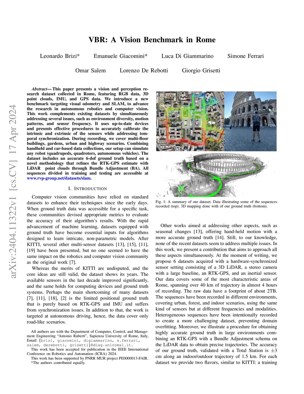 This paper presents a vision and perception research dataset collected in Rome, featuring RGB data, 3D point clouds, IMU, and GPS data. We introduce a new benchmark targeting visual odometry and SLAM, to advance the research in autonomous robotics and computer vision. This work complements existing datasets by simultaneously addressing several issues, such as environment diversity, motion patterns, and sensor frequency. It uses up-to-date devices and presents effective procedures to accurately calibrate the intrinsic and extrinsic of the sensors while addressing temporal synchronization. During recording, we cover multi-floor buildings, gardens, urban and highway scenarios. Combining handheld and car-based data collections, our setup can simulate any robot (quadrupeds, quadrotors, autonomous vehicles). The dataset includes an accurate 6-dof ground truth based on a novel methodology that refines the RTK-GPS estimate with LiDAR point clouds through Bundle Adjustment. All sequences divided in training and testing are accessible through our website.
