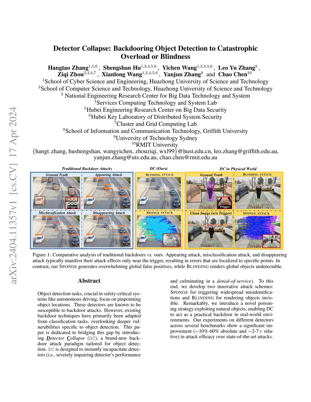 Object detection tasks, crucial in safety-critical systems like autonomous driving, focus on pinpointing object locations. These detectors are known to be susceptible to backdoor attacks. However, existing backdoor techniques have primarily been adapted from classification tasks, overlooking deeper vulnerabilities specific to object detection. This paper is dedicated to bridging this gap by introducing Detector Collapse} (DC), a brand-new backdoor attack paradigm tailored for object detection. DC is designed to instantly incapacitate detectors (i.e., severely impairing detector's performance and culminating in a denial-of-service). To this end, we develop two innovative attack schemes: Sponge for triggering widespread misidentifications and Blinding for rendering objects invisible. Remarkably, we introduce a novel poisoning strategy exploiting natural objects, enabling DC to act as a practical backdoor in real-world environments. Our experiments on different detectors across several benchmarks show a significant improvement (10\%-60\% absolute and 2-7 relative) in attack efficacy over state-of-the-art attacks.