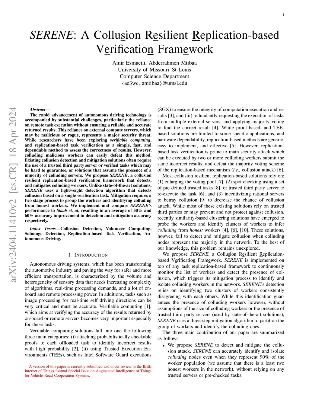 The rapid advancement of autonomous driving technology is accompanied by substantial challenges, particularly the reliance on remote task execution without ensuring a reliable and accurate returned results. This reliance on external compute servers, which may be malicious or rogue, represents a major security threat. While researchers have been exploring verifiable computing, and replication-based task verification as a simple, fast, and dependable method to assess the correctness of results. However, colluding malicious workers can easily defeat this method. Existing collusion detection and mitigation solutions often require the use of a trusted third party server or verified tasks which may be hard to guarantee, or solutions that assume the presence of a minority of colluding servers. We propose SERENE, a collusion resilient replication-based verification framework that detects, and mitigates colluding workers. Unlike state-of-the-art solutions, SERENE uses a lightweight detection algorithm that detects collusion based on a single verification task. Mitigation requires a two stage process to group the workers and identifying colluding from honest workers. We implement and compare SERENE's performance to Staab et. al, resulting in an average of 50\% and 60\% accuracy improvement in detection and mitigation accuracy respectively.