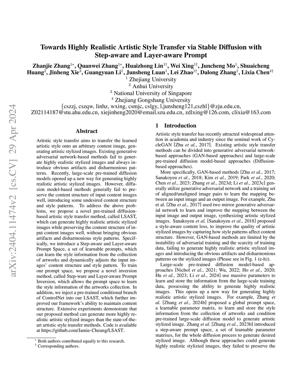 Artistic style transfer aims to transfer the learned artistic style onto an arbitrary content image, generating artistic stylized images. Existing generative adversarial network-based methods fail to generate highly realistic stylized images and always introduce obvious artifacts and disharmonious patterns. Recently, large-scale pre-trained diffusion models opened up a new way for generating highly realistic artistic stylized images. However, diffusion model-based methods generally fail to preserve the content structure of input content images well, introducing some undesired content structure and style patterns. To address the above problems, we propose a novel pre-trained diffusion-based artistic style transfer method, called LSAST, which can generate highly realistic artistic stylized images while preserving the content structure of input content images well, without bringing obvious artifacts and disharmonious style patterns. Specifically, we introduce a Step-aware and Layer-aware Prompt Space, a set of learnable prompts, which can learn the style information from the collection of artworks and dynamically adjusts the input images' content structure and style pattern. To train our prompt space, we propose a novel inversion method, called Step-ware and Layer-aware Prompt Inversion, which allows the prompt space to learn the style information of the artworks collection. In addition, we inject a pre-trained conditional branch of ControlNet into our LSAST, which further improved our framework's ability to maintain content structure. Extensive experiments demonstrate that our proposed method can generate more highly realistic artistic stylized images than the state-of-the-art artistic style transfer methods.