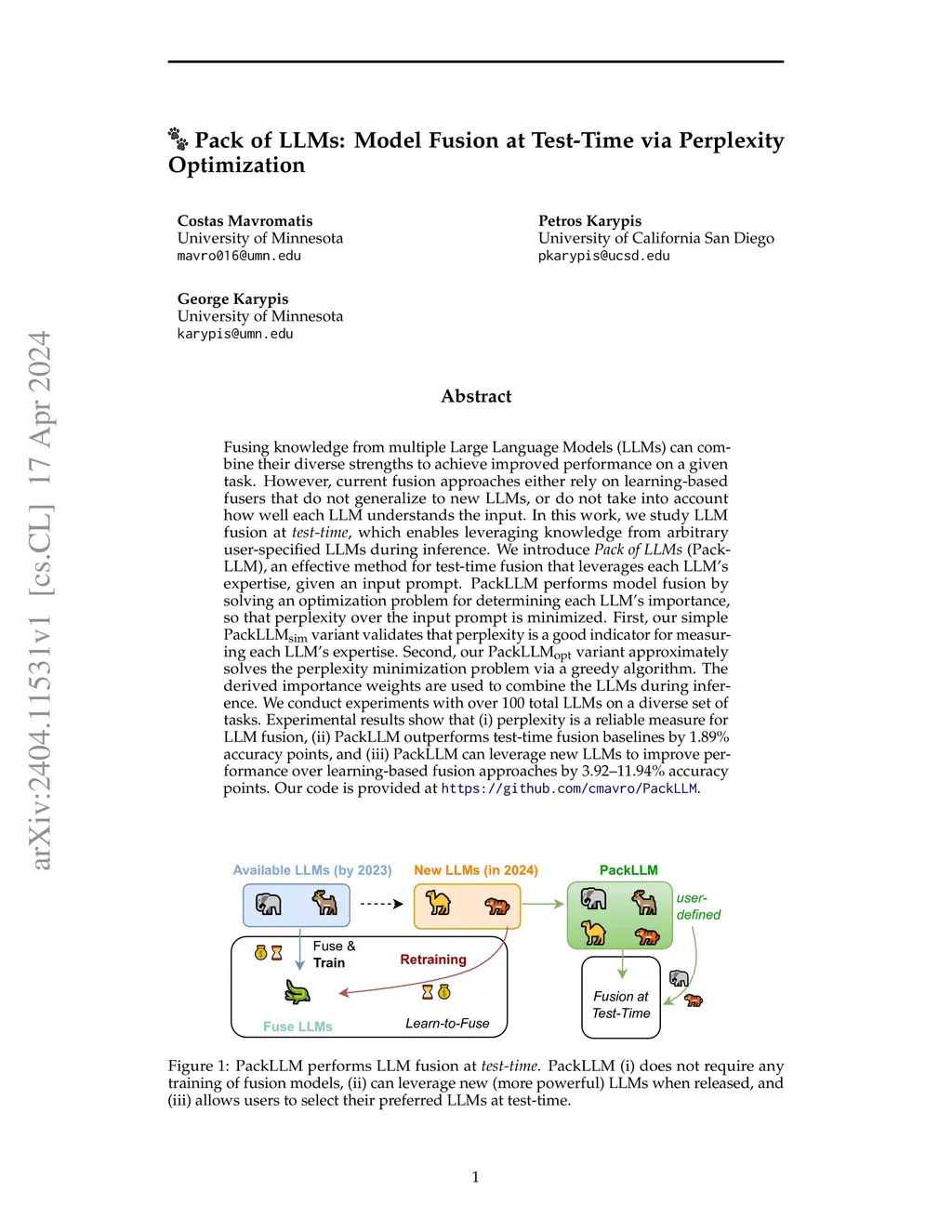 Fusing knowledge from multiple Large Language Models (LLMs) can combine their diverse strengths to achieve improved performance on a given task. However, current fusion approaches either rely on learning-based fusers that do not generalize to new LLMs, or do not take into account how well each LLM understands the input. In this work, we study LLM fusion at test-time, which enables leveraging knowledge from arbitrary user-specified LLMs during inference. We introduce Pack of LLMs (PackLLM), an effective method for test-time fusion that leverages each LLM's expertise, given an input prompt. PackLLM performs model fusion by solving an optimization problem for determining each LLM's importance, so that perplexity over the input prompt is minimized. First, our simple PackLLM-sim variant validates that perplexity is a good indicator for measuring each LLM's expertise. Second, our PackLLM-opt variant approximately solves the perplexity minimization problem via a greedy algorithm. The derived importance weights are used to combine the LLMs during inference. We conduct experiments with over 100 total LLMs on a diverse set of tasks. Experimental results show that (i) perplexity is a reliable measure for LLM fusion, (ii) PackLLM outperforms test-time fusion baselines by 1.89% accuracy points, and (iii) PackLLM can leverage new LLMs to improve performance over learning-based fusion approaches by 3.92-11.94% accuracy points.