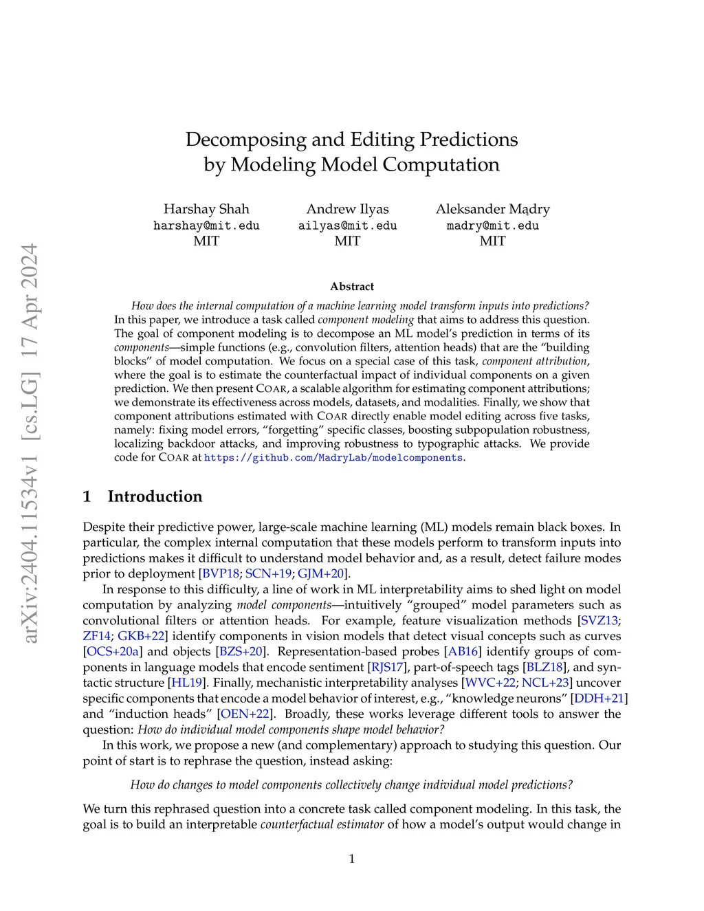 How does the internal computation of a machine learning model transform inputs into predictions? In this paper, we introduce a task called component modeling that aims to address this question. The goal of component modeling is to decompose an ML model's prediction in terms of its components -- simple functions (e.g., convolution filters, attention heads) that are the "building blocks" of model computation. We focus on a special case of this task, component attribution, where the goal is to estimate the counterfactual impact of individual components on a given prediction. We then present COAR, a scalable algorithm for estimating component attributions; we demonstrate its effectiveness across models, datasets, and modalities. Finally, we show that component attributions estimated with COAR directly enable model editing across five tasks, namely: fixing model errors, ``forgetting'' specific classes, boosting subpopulation robustness, localizing backdoor attacks, and improving robustness to typographic attacks. We provide code for COAR at https://github.com/MadryLab/modelcomponents .