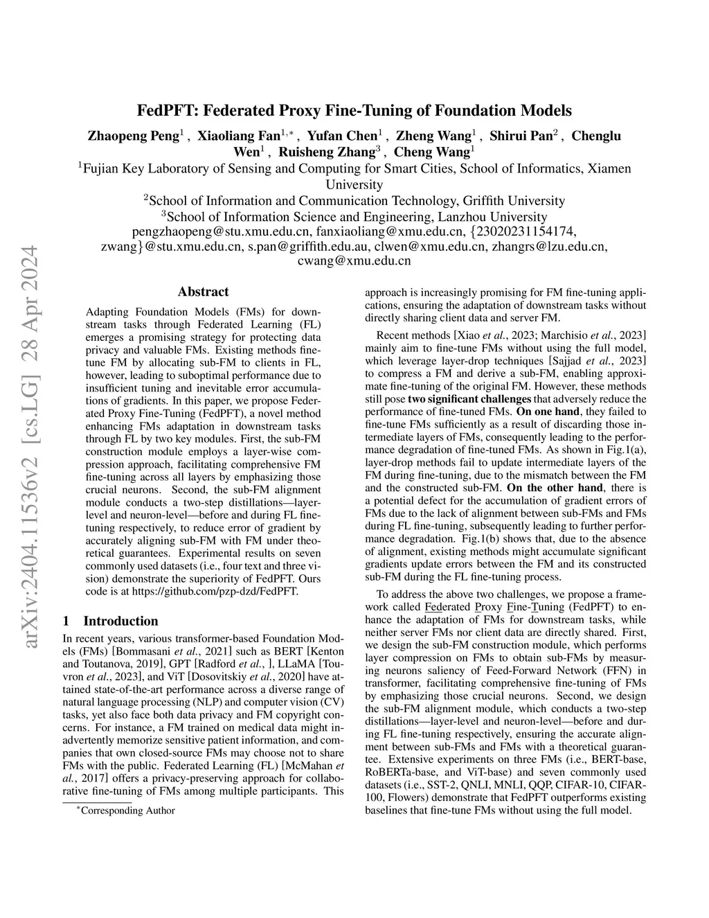 Adapting Foundation Models (FMs) for downstream tasks through Federated Learning (FL) emerges a promising strategy for protecting data privacy and valuable FMs. Existing methods fine-tune FM by allocating sub-FM to clients in FL, however, leading to suboptimal performance due to insufficient tuning and inevitable error accumulations of gradients. In this paper, we propose Federated Proxy Fine-Tuning (FedPFT), a novel method enhancing FMs adaptation in downstream tasks through FL by two key modules. First, the sub-FM construction module employs a layer-wise compression approach, facilitating comprehensive FM fine-tuning across all layers by emphasizing those crucial neurons. Second, the sub-FM alignment module conducts a two-step distillations-layer-level and neuron-level-before and during FL fine-tuning respectively, to reduce error of gradient by accurately aligning sub-FM with FM under theoretical guarantees. Experimental results on seven commonly used datasets (i.e., four text and three vision) demonstrate the superiority of FedPFT.