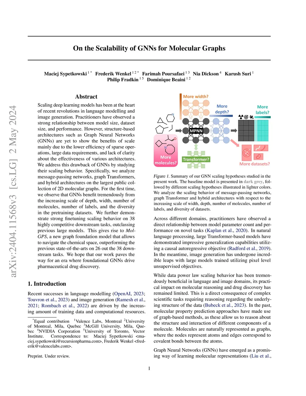 Scaling deep learning models has been at the heart of recent revolutions in language modelling and image generation. Practitioners have observed a strong relationship between model size, dataset size, and performance. However, structure-based architectures such as Graph Neural Networks (GNNs) are yet to show the benefits of scale mainly due to the lower efficiency of sparse operations, large data requirements, and lack of clarity about the effectiveness of various architectures. We address this drawback of GNNs by studying their scaling behavior. Specifically, we analyze message-passing networks, graph Transformers, and hybrid architectures on the largest public collection of 2D molecular graphs. For the first time, we observe that GNNs benefit tremendously from the increasing scale of depth, width, number of molecules, number of labels, and the diversity in the pretraining datasets. We further demonstrate strong finetuning scaling behavior on 38 highly competitive downstream tasks, outclassing previous large models. This gives rise to MolGPS, a new graph foundation model that allows to navigate the chemical space, outperforming the previous state-of-the-arts on 26 out the 38 downstream tasks. We hope that our work paves the way for an era where foundational GNNs drive pharmaceutical drug discovery.