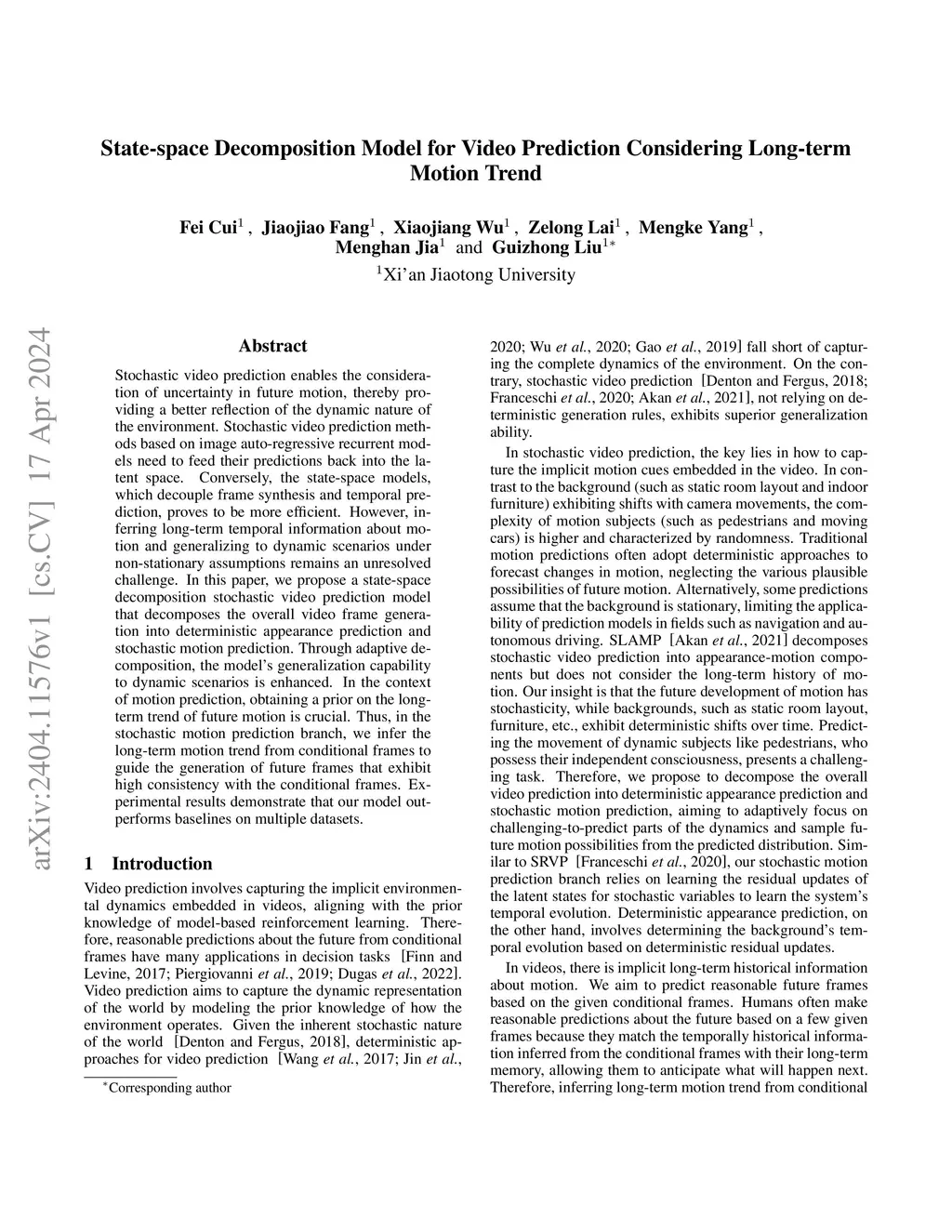 Stochastic video prediction enables the consideration of uncertainty in future motion, thereby providing a better reflection of the dynamic nature of the environment. Stochastic video prediction methods based on image auto-regressive recurrent models need to feed their predictions back into the latent space. Conversely, the state-space models, which decouple frame synthesis and temporal prediction, proves to be more efficient. However, inferring long-term temporal information about motion and generalizing to dynamic scenarios under non-stationary assumptions remains an unresolved challenge. In this paper, we propose a state-space decomposition stochastic video prediction model that decomposes the overall video frame generation into deterministic appearance prediction and stochastic motion prediction. Through adaptive decomposition, the model's generalization capability to dynamic scenarios is enhanced. In the context of motion prediction, obtaining a prior on the long-term trend of future motion is crucial. Thus, in the stochastic motion prediction branch, we infer the long-term motion trend from conditional frames to guide the generation of future frames that exhibit high consistency with the conditional frames. Experimental results demonstrate that our model outperforms baselines on multiple datasets.