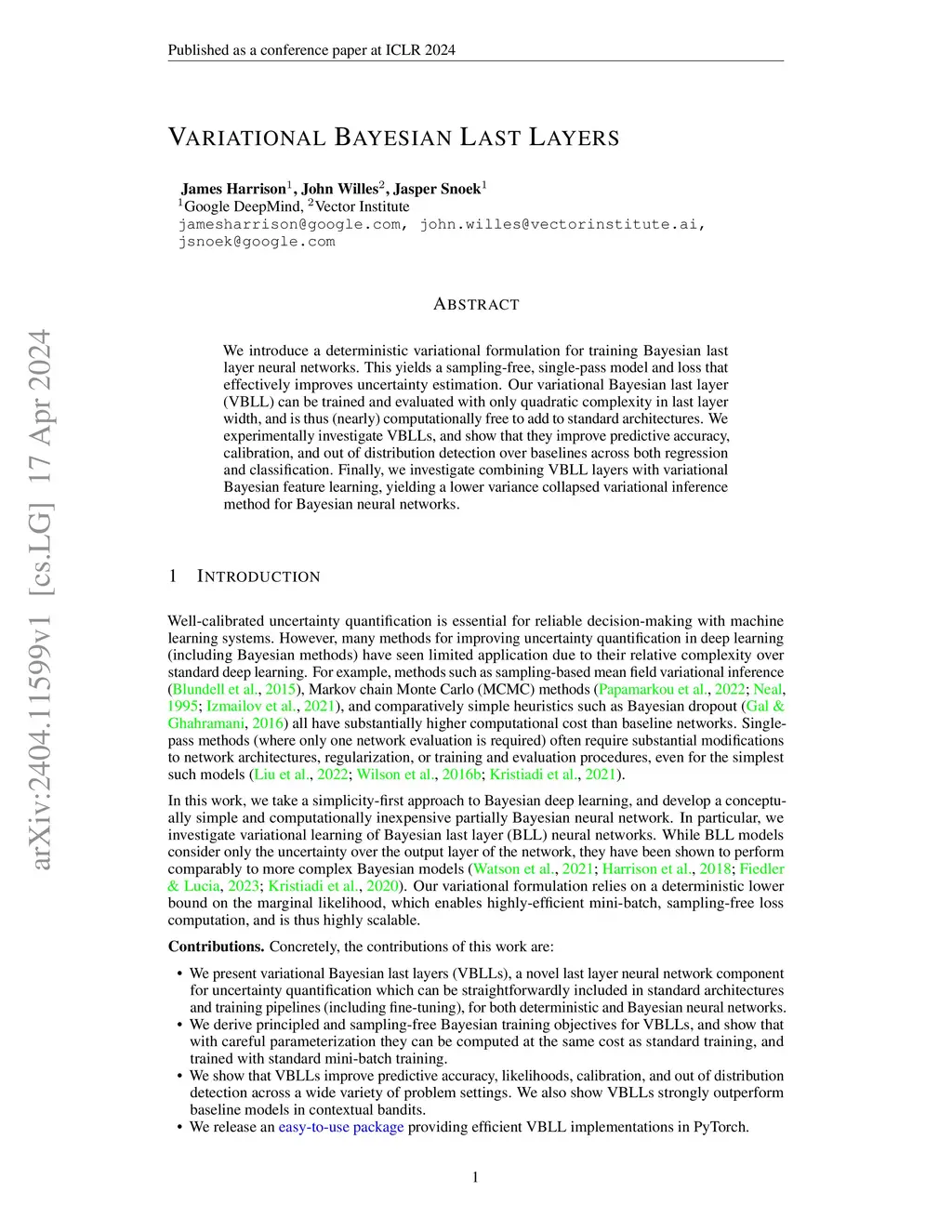 We introduce a deterministic variational formulation for training Bayesian last layer neural networks. This yields a sampling-free, single-pass model and loss that effectively improves uncertainty estimation. Our variational Bayesian last layer (VBLL) can be trained and evaluated with only quadratic complexity in last layer width, and is thus (nearly) computationally free to add to standard architectures. We experimentally investigate VBLLs, and show that they improve predictive accuracy, calibration, and out of distribution detection over baselines across both regression and classification. Finally, we investigate combining VBLL layers with variational Bayesian feature learning, yielding a lower variance collapsed variational inference method for Bayesian neural networks.