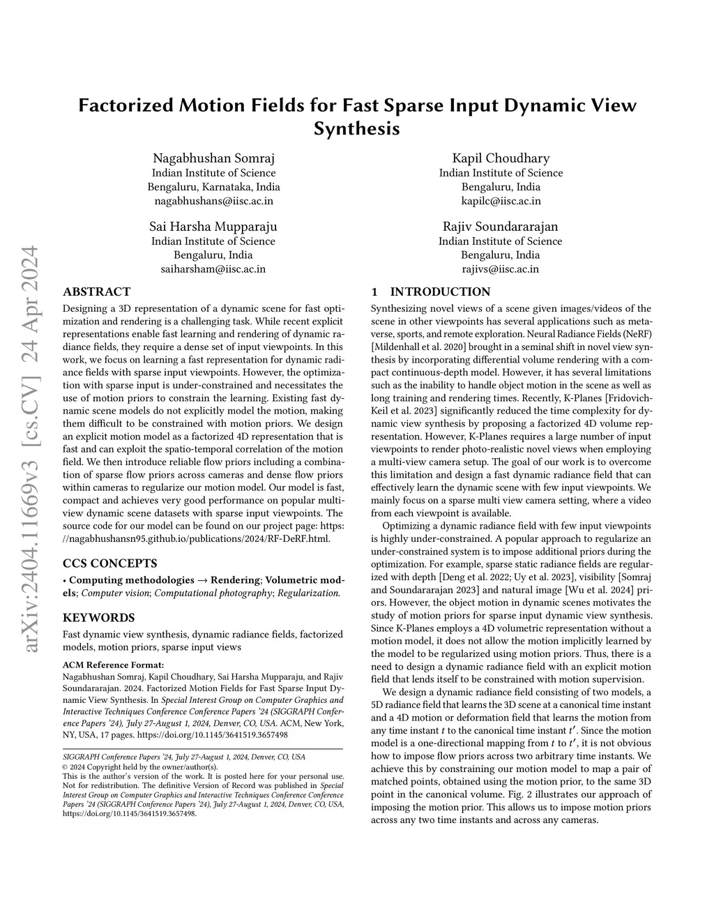 Factorized Motion Fields for Fast Sparse Input Dynamic View Synthesis