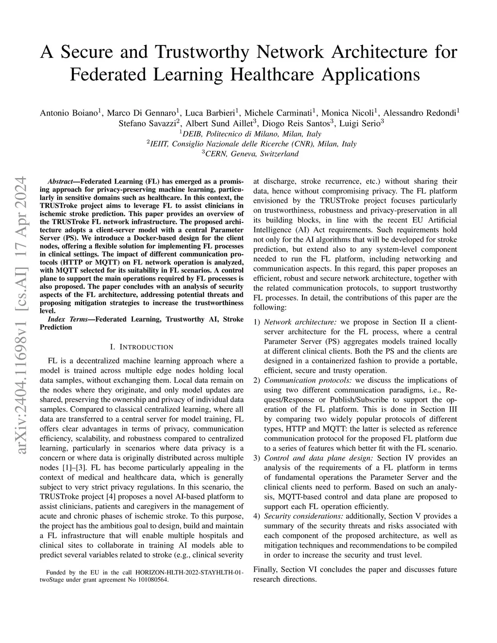 Federated Learning (FL) has emerged as a promising approach for privacy-preserving machine learning, particularly in sensitive domains such as healthcare. In this context, the TRUSTroke project aims to leverage FL to assist clinicians in ischemic stroke prediction. This paper provides an overview of the TRUSTroke FL network infrastructure. The proposed architecture adopts a client-server model with a central Parameter Server (PS). We introduce a Docker-based design for the client nodes, offering a flexible solution for implementing FL processes in clinical settings. The impact of different communication protocols (HTTP or MQTT) on FL network operation is analyzed, with MQTT selected for its suitability in FL scenarios. A control plane to support the main operations required by FL processes is also proposed. The paper concludes with an analysis of security aspects of the FL architecture, addressing potential threats and proposing mitigation strategies to increase the trustworthiness level.