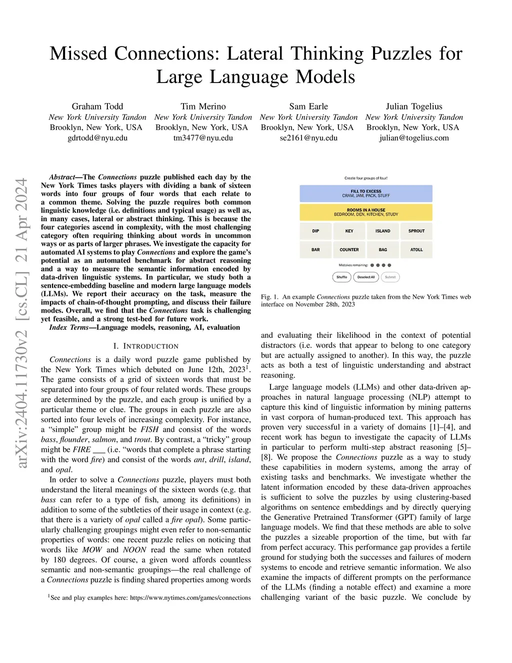 The Connections puzzle published each day by the New York Times tasks players with dividing a bank of sixteen words into four groups of four words that each relate to a common theme. Solving the puzzle requires both common linguistic knowledge (i.e. definitions and typical usage) as well as, in many cases, lateral or abstract thinking. This is because the four categories ascend in complexity, with the most challenging category often requiring thinking about words in uncommon ways or as parts of larger phrases. We investigate the capacity for automated AI systems to play Connections and explore the game's potential as an automated benchmark for abstract reasoning and a way to measure the semantic information encoded by data-driven linguistic systems. In particular, we study both a sentence-embedding baseline and modern large language models (LLMs). We report their accuracy on the task, measure the impacts of chain-of-thought prompting, and discuss their failure modes. Overall, we find that the Connections task is challenging yet feasible, and a strong test-bed for future work.