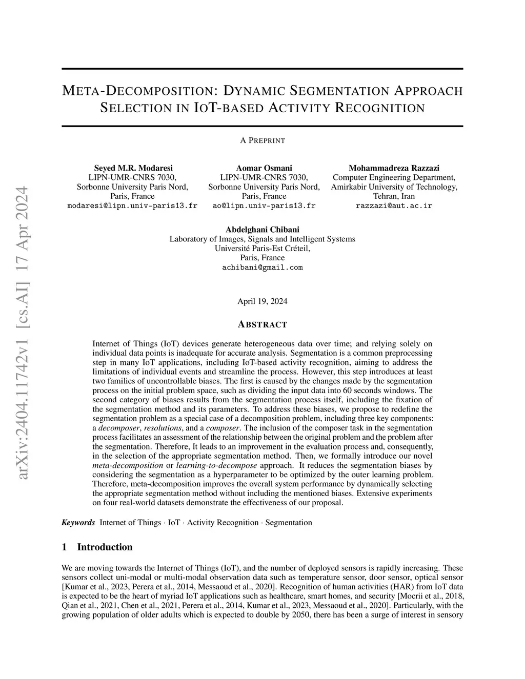 Internet of Things (IoT) devices generate heterogeneous data over time; and relying solely on individual data points is inadequate for accurate analysis. Segmentation is a common preprocessing step in many IoT applications, including IoT-based activity recognition, aiming to address the limitations of individual events and streamline the process. However, this step introduces at least two families of uncontrollable biases. The first is caused by the changes made by the segmentation process on the initial problem space, such as dividing the input data into 60 seconds windows. The second category of biases results from the segmentation process itself, including the fixation of the segmentation method and its parameters. To address these biases, we propose to redefine the segmentation problem as a special case of a decomposition problem, including three key components: a decomposer, resolutions, and a composer. The inclusion of the composer task in the segmentation process facilitates an assessment of the relationship between the original problem and the problem after the segmentation. Therefore, It leads to an improvement in the evaluation process and, consequently, in the selection of the appropriate segmentation method. Then, we formally introduce our novel meta-decomposition or learning-to-decompose approach. It reduces the segmentation biases by considering the segmentation as a hyperparameter to be optimized by the outer learning problem. Therefore, meta-decomposition improves the overall system performance by dynamically selecting the appropriate segmentation method without including the mentioned biases. Extensive experiments on four real-world datasets demonstrate the effectiveness of our proposal.