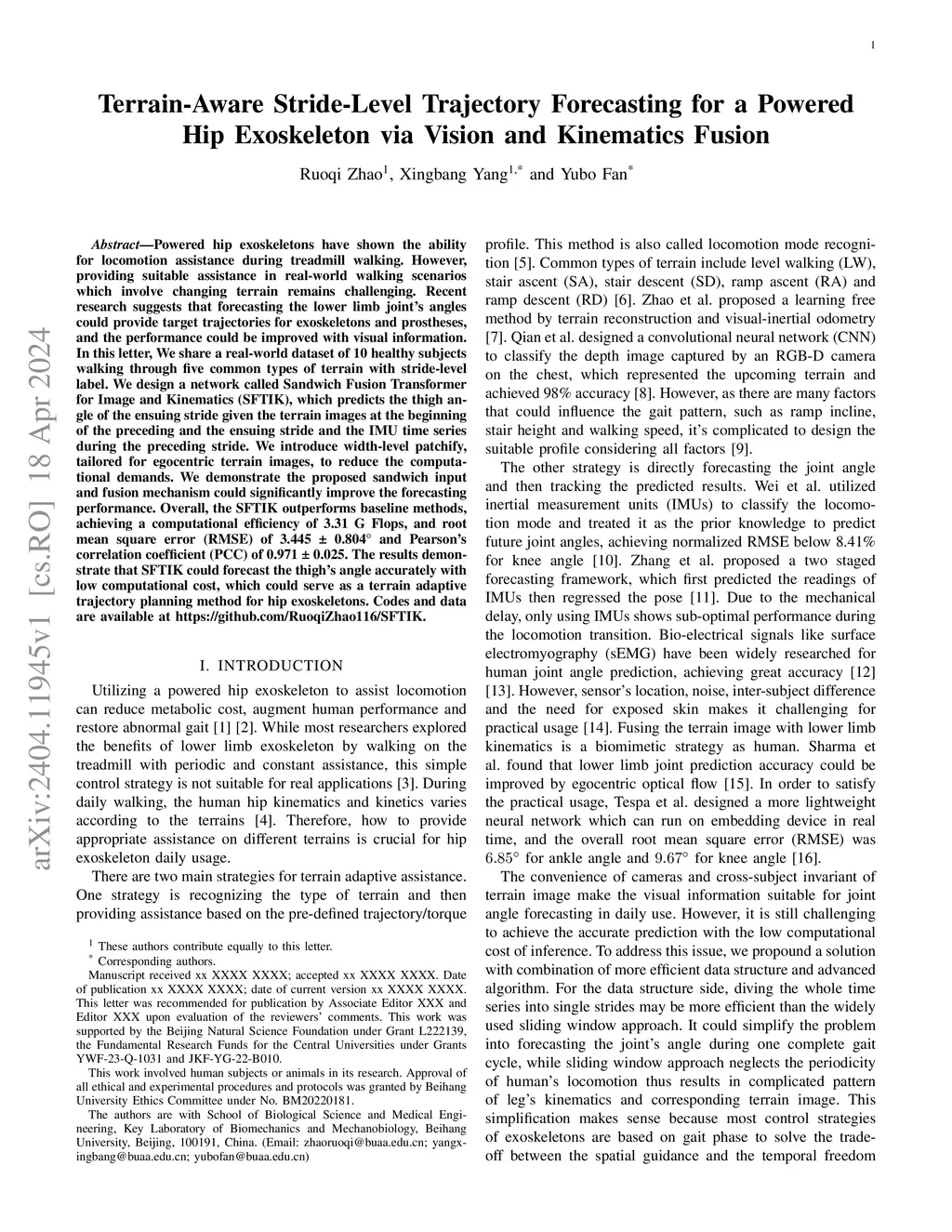 Powered hip exoskeletons have shown the ability for locomotion assistance during treadmill walking. However, providing suitable assistance in real-world walking scenarios which involve changing terrain remains challenging. Recent research suggests that forecasting the lower limb joint's angles could provide target trajectories for exoskeletons and prostheses, and the performance could be improved with visual information. In this letter, We share a real-world dataset of 10 healthy subjects walking through five common types of terrain with stride-level label. We design a network called Sandwich Fusion Transformer for Image and Kinematics (SFTIK), which predicts the thigh angle of the ensuing stride given the terrain images at the beginning of the preceding and the ensuing stride and the IMU time series during the preceding stride. We introduce width-level patchify, tailored for egocentric terrain images, to reduce the computational demands. We demonstrate the proposed sandwich input and fusion mechanism could significantly improve the forecasting performance. Overall, the SFTIK outperforms baseline methods, achieving a computational efficiency of 3.31 G Flops, and root mean square error (RMSE) of 3.445 \textpm \ 0.804\textdegree \ and Pearson's correlation coefficient (PCC) of 0.971 \textpm\ 0.025. The results demonstrate that SFTIK could forecast the thigh's angle accurately with low computational cost, which could serve as a terrain adaptive trajectory planning method for hip exoskeletons. Codes and data are available at https://github.com/RuoqiZhao116/SFTIK.