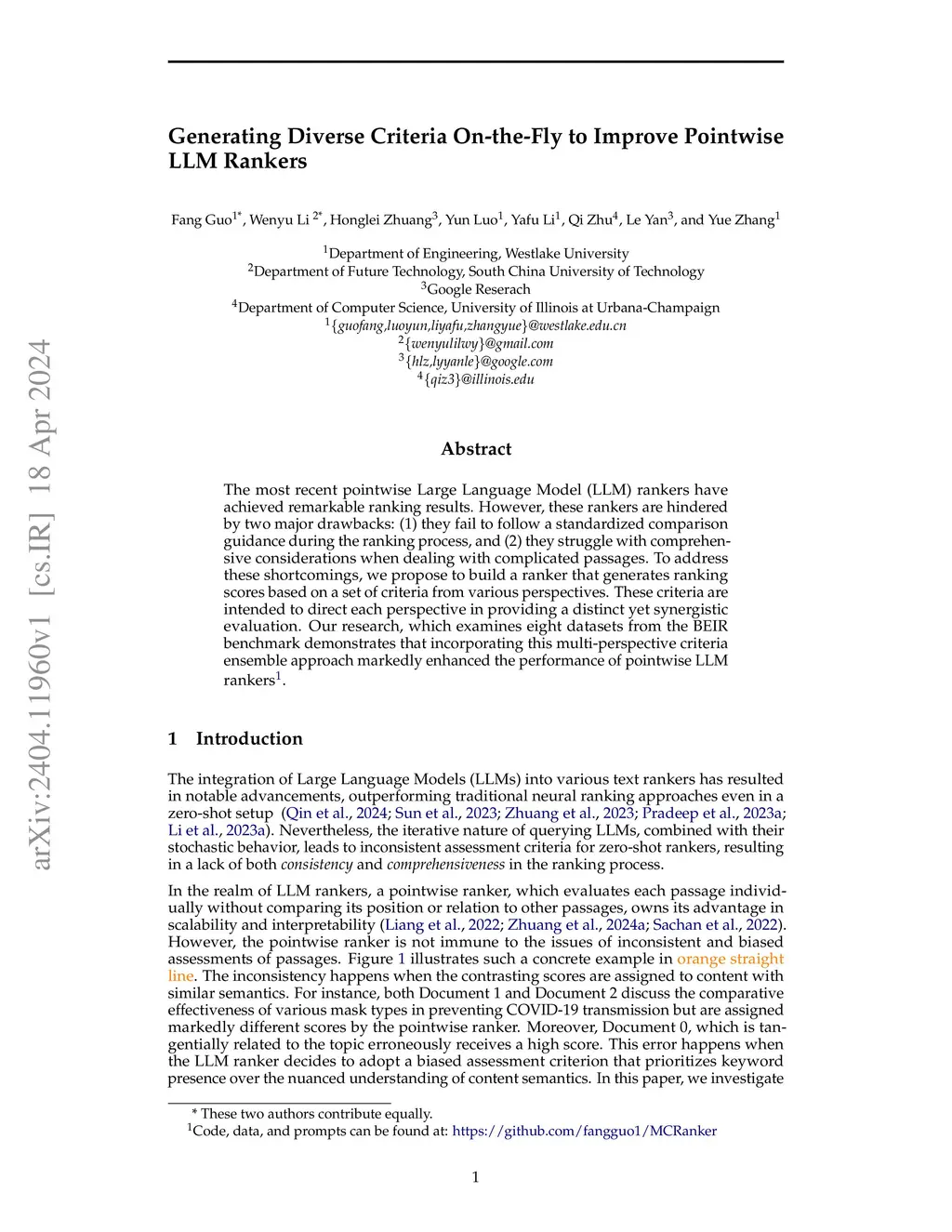 The most recent pointwise Large Language Model (LLM) rankers have achieved remarkable ranking results. However, these rankers are hindered by two major drawbacks: (1) they fail to follow a standardized comparison guidance during the ranking process, and (2) they struggle with comprehensive considerations when dealing with complicated passages. To address these shortcomings, we propose to build a ranker that generates ranking scores based on a set of criteria from various perspectives. These criteria are intended to direct each perspective in providing a distinct yet synergistic evaluation. Our research, which examines eight datasets from the BEIR benchmark demonstrates that incorporating this multi-perspective criteria ensemble approach markedly enhanced the performance of pointwise LLM rankers.