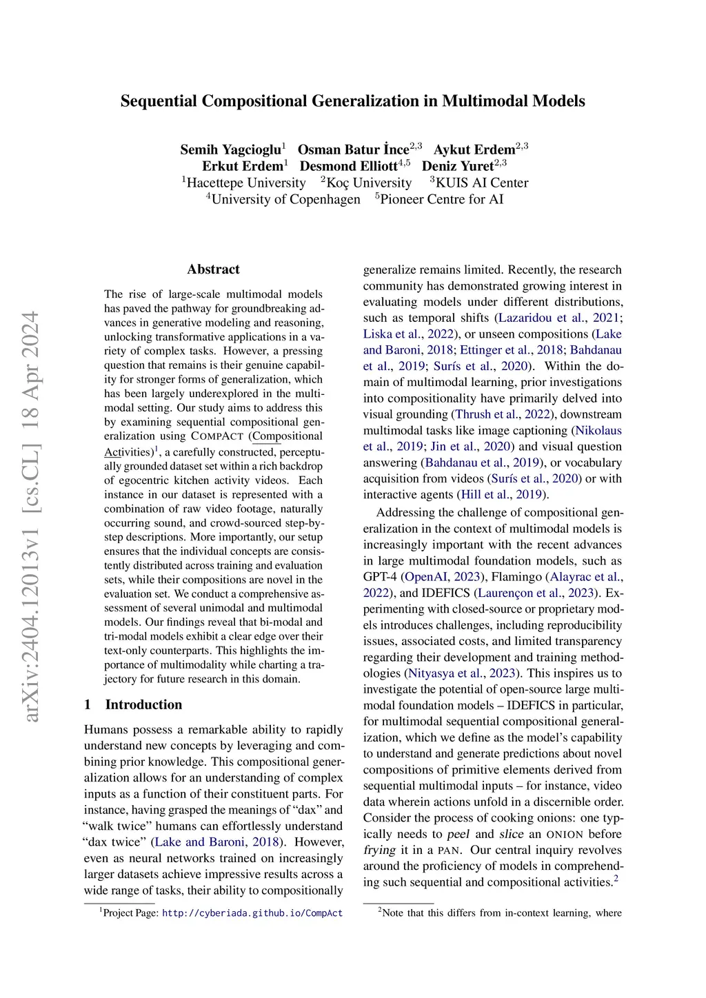 The rise of large-scale multimodal models has paved the pathway for groundbreaking advances in generative modeling and reasoning, unlocking transformative applications in a variety of complex tasks. However, a pressing question that remains is their genuine capability for stronger forms of generalization, which has been largely underexplored in the multimodal setting. Our study aims to address this by examining sequential compositional generalization using \textsc{CompAct} (\underline{Comp}ositional \underline{Act}ivities)\footnote{Project Page: \url{http://cyberiada.github.io/CompAct}}, a carefully constructed, perceptually grounded dataset set within a rich backdrop of egocentric kitchen activity videos. Each instance in our dataset is represented with a combination of raw video footage, naturally occurring sound, and crowd-sourced step-by-step descriptions. More importantly, our setup ensures that the individual concepts are consistently distributed across training and evaluation sets, while their compositions are novel in the evaluation set. We conduct a comprehensive assessment of several unimodal and multimodal models. Our findings reveal that bi-modal and tri-modal models exhibit a clear edge over their text-only counterparts. This highlights the importance of multimodality while charting a trajectory for future research in this domain.