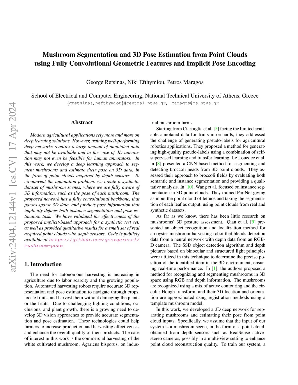 Mushroom Segmentation and 3D Pose Estimation from Point Clouds using
