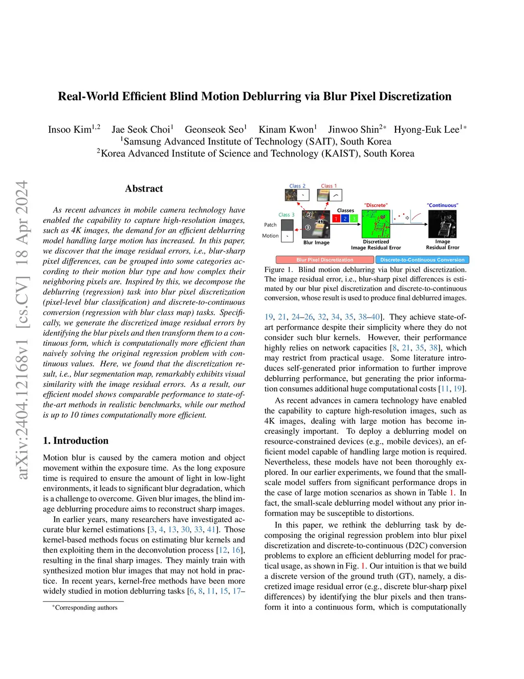 As recent advances in mobile camera technology have enabled the capability to capture high-resolution images, such as 4K images, the demand for an efficient deblurring model handling large motion has increased. In this paper, we discover that the image residual errors, i.e., blur-sharp pixel differences, can be grouped into some categories according to their motion blur type and how complex their neighboring pixels are. Inspired by this, we decompose the deblurring (regression) task into blur pixel discretization (pixel-level blur classification) and discrete-to-continuous conversion (regression with blur class map) tasks. Specifically, we generate the discretized image residual errors by identifying the blur pixels and then transform them to a continuous form, which is computationally more efficient than naively solving the original regression problem with continuous values. Here, we found that the discretization result, i.e., blur segmentation map, remarkably exhibits visual similarity with the image residual errors. As a result, our efficient model shows comparable performance to state-of-the-art methods in realistic benchmarks, while our method is up to 10 times computationally more efficient.