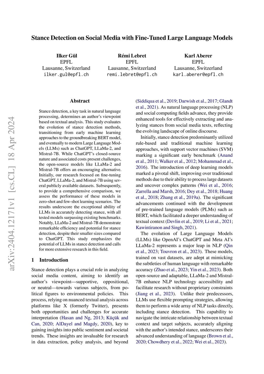Stance detection, a key task in natural language processing, determines an author's viewpoint based on textual analysis. This study evaluates the evolution of stance detection methods, transitioning from early machine learning approaches to the groundbreaking BERT model, and eventually to modern Large Language Models (LLMs) such as ChatGPT, LLaMa-2, and Mistral-7B. While ChatGPT's closed-source nature and associated costs present challenges, the open-source models like LLaMa-2 and Mistral-7B offers an encouraging alternative. Initially, our research focused on fine-tuning ChatGPT, LLaMa-2, and Mistral-7B using several publicly available datasets. Subsequently, to provide a comprehensive comparison, we assess the performance of these models in zero-shot and few-shot learning scenarios. The results underscore the exceptional ability of LLMs in accurately detecting stance, with all tested models surpassing existing benchmarks. Notably, LLaMa-2 and Mistral-7B demonstrate remarkable efficiency and potential for stance detection, despite their smaller sizes compared to ChatGPT. This study emphasizes the potential of LLMs in stance detection and calls for more extensive research in this field.