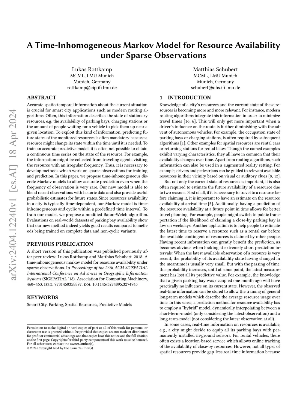 Accurate spatio-temporal information about the current situation is crucial for smart city applications such as modern routing algorithms. Often, this information describes the state of stationary resources, e.g. the availability of parking bays, charging stations or the amount of people waiting for a vehicle to pick them up near a given location. To exploit this kind of information, predicting future states of the monitored resources is often mandatory because a resource might change its state within the time until it is needed. To train an accurate predictive model, it is often not possible to obtain a continuous time series on the state of the resource. For example, the information might be collected from traveling agents visiting the resource with an irregular frequency. Thus, it is necessary to develop methods which work on sparse observations for training and prediction. In this paper, we propose time-inhomogeneous discrete Markov models to allow accurate prediction even when the frequency of observation is very rare. Our new model is able to blend recent observations with historic data and also provide useful probabilistic estimates for future states. Since resources availability in a city is typically time-dependent, our Markov model is time-inhomogeneous and cyclic within a predefined time interval. To train our model, we propose a modified Baum-Welch algorithm. Evaluations on real-world datasets of parking bay availability show that our new method indeed yields good results compared to methods being trained on complete data and non-cyclic variants.