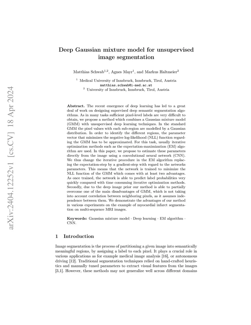 The recent emergence of deep learning has led to a great deal of work on designing supervised deep semantic segmentation algorithms. As in many tasks sufficient pixel-level labels are very difficult to obtain, we propose a method which combines a Gaussian mixture model (GMM) with unsupervised deep learning techniques. In the standard GMM the pixel values with each sub-region are modelled by a Gaussian distribution. In order to identify the different regions, the parameter vector that minimizes the negative log-likelihood (NLL) function regarding the GMM has to be approximated. For this task, usually iterative optimization methods such as the expectation-maximization (EM) algorithm are used. In this paper, we propose to estimate these parameters directly from the image using a convolutional neural network (CNN). We thus change the iterative procedure in the EM algorithm replacing the expectation-step by a gradient-step with regard to the networks parameters. This means that the network is trained to minimize the NLL function of the GMM which comes with at least two advantages. As once trained, the network is able to predict label probabilities very quickly compared with time consuming iterative optimization methods. Secondly, due to the deep image prior our method is able to partially overcome one of the main disadvantages of GMM, which is not taking into account correlation between neighboring pixels, as it assumes independence between them. We demonstrate the advantages of our method in various experiments on the example of myocardial infarct segmentation on multi-sequence MRI images.
