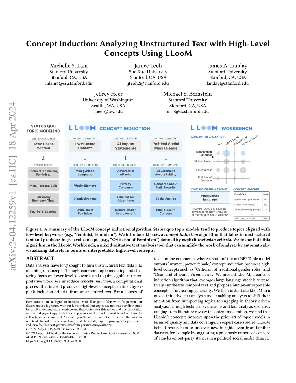 Data analysts have long sought to turn unstructured text data into meaningful concepts. Though common, topic modeling and clustering focus on lower-level keywords and require significant interpretative work. We introduce concept induction, a computational process that instead produces high-level concepts, defined by explicit inclusion criteria, from unstructured text. For a dataset of toxic online comments, where a state-of-the-art BERTopic model outputs "women, power, female," concept induction produces high-level concepts such as "Criticism of traditional gender roles" and "Dismissal of women's concerns." We present LLooM, a concept induction algorithm that leverages large language models to iteratively synthesize sampled text and propose human-interpretable concepts of increasing generality. We then instantiate LLooM in a mixed-initiative text analysis tool, enabling analysts to shift their attention from interpreting topics to engaging in theory-driven analysis. Through technical evaluations and four analysis scenarios ranging from literature review to content moderation, we find that LLooM's concepts improve upon the prior art of topic models in terms of quality and data coverage. In expert case studies, LLooM helped researchers to uncover new insights even from familiar datasets, for example by suggesting a previously unnoticed concept of attacks on out-party stances in a political social media dataset.