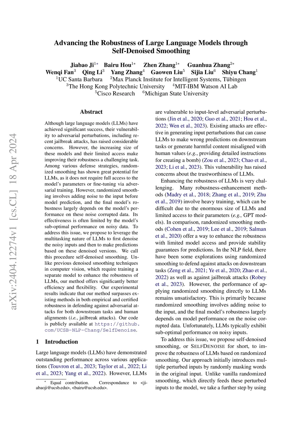 Although large language models (LLMs) have achieved significant success, their vulnerability to adversarial perturbations, including recent jailbreak attacks, has raised considerable concerns. However, the increasing size of these models and their limited access make improving their robustness a challenging task. Among various defense strategies, randomized smoothing has shown great potential for LLMs, as it does not require full access to the model's parameters or fine-tuning via adversarial training. However, randomized smoothing involves adding noise to the input before model prediction, and the final model's robustness largely depends on the model's performance on these noise corrupted data. Its effectiveness is often limited by the model's sub-optimal performance on noisy data. To address this issue, we propose to leverage the multitasking nature of LLMs to first denoise the noisy inputs and then to make predictions based on these denoised versions. We call this procedure self-denoised smoothing. Unlike previous denoised smoothing techniques in computer vision, which require training a separate model to enhance the robustness of LLMs, our method offers significantly better efficiency and flexibility. Our experimental results indicate that our method surpasses existing methods in both empirical and certified robustness in defending against adversarial attacks for both downstream tasks and human alignments (i.e., jailbreak attacks). Our code is publicly available at https://github.com/UCSB-NLP-Chang/SelfDenoise