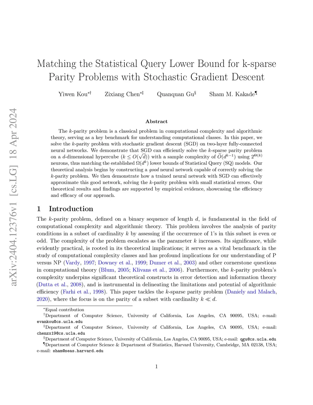 The -parity problem is a classical problem in computational complexity and algorithmic theory, serving as a key benchmark for understanding computational classes. In this paper, we solve the -parity problem with stochastic gradient descent (SGD) on two-layer fully-connected neural networks. We demonstrate that SGD can efficiently solve the -sparse parity problem on a -dimensional hypercube () with a sample complexity of using neurons, thus matching the established lower bounds of Statistical Query (SQ) models. Our theoretical analysis begins by constructing a good neural network capable of correctly solving the -parity problem. We then demonstrate how a trained neural network with SGD can effectively approximate this good network, solving the -parity problem with small statistical errors. Our theoretical results and findings are supported by empirical evidence, showcasing the efficiency and efficacy of our approach.