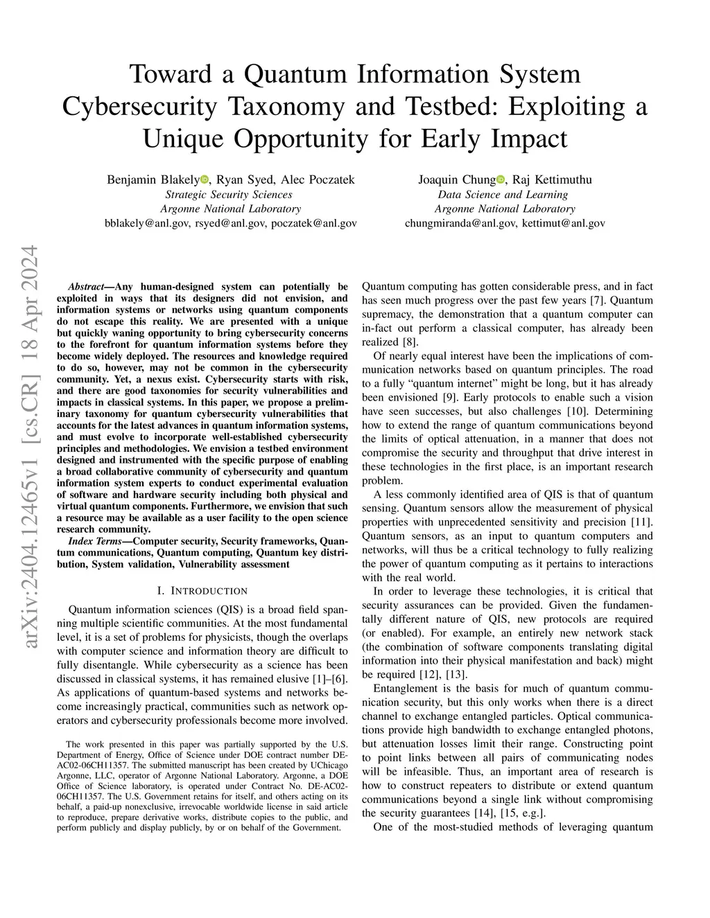 Any human-designed system can potentially be exploited in ways that its designers did not envision, and information systems or networks using quantum components do not escape this reality. We are presented with a unique but quickly waning opportunity to bring cybersecurity concerns to the forefront for quantum information systems before they become widely deployed. The resources and knowledge required to do so, however, may not be common in the cybersecurity community. Yet, a nexus exist. Cybersecurity starts with risk, and there are good taxonomies for security vulnerabilities and impacts in classical systems. In this paper, we propose a preliminary taxonomy for quantum cybersecurity vulnerabilities that accounts for the latest advances in quantum information systems, and must evolve to incorporate well-established cybersecurity principles and methodologies. We envision a testbed environment designed and instrumented with the specific purpose of enabling a broad collaborative community of cybersecurity and quantum information system experts to conduct experimental evaluation of software and hardware security including both physical and virtual quantum components. Furthermore, we envision that such a resource may be available as a user facility to the open science research community.