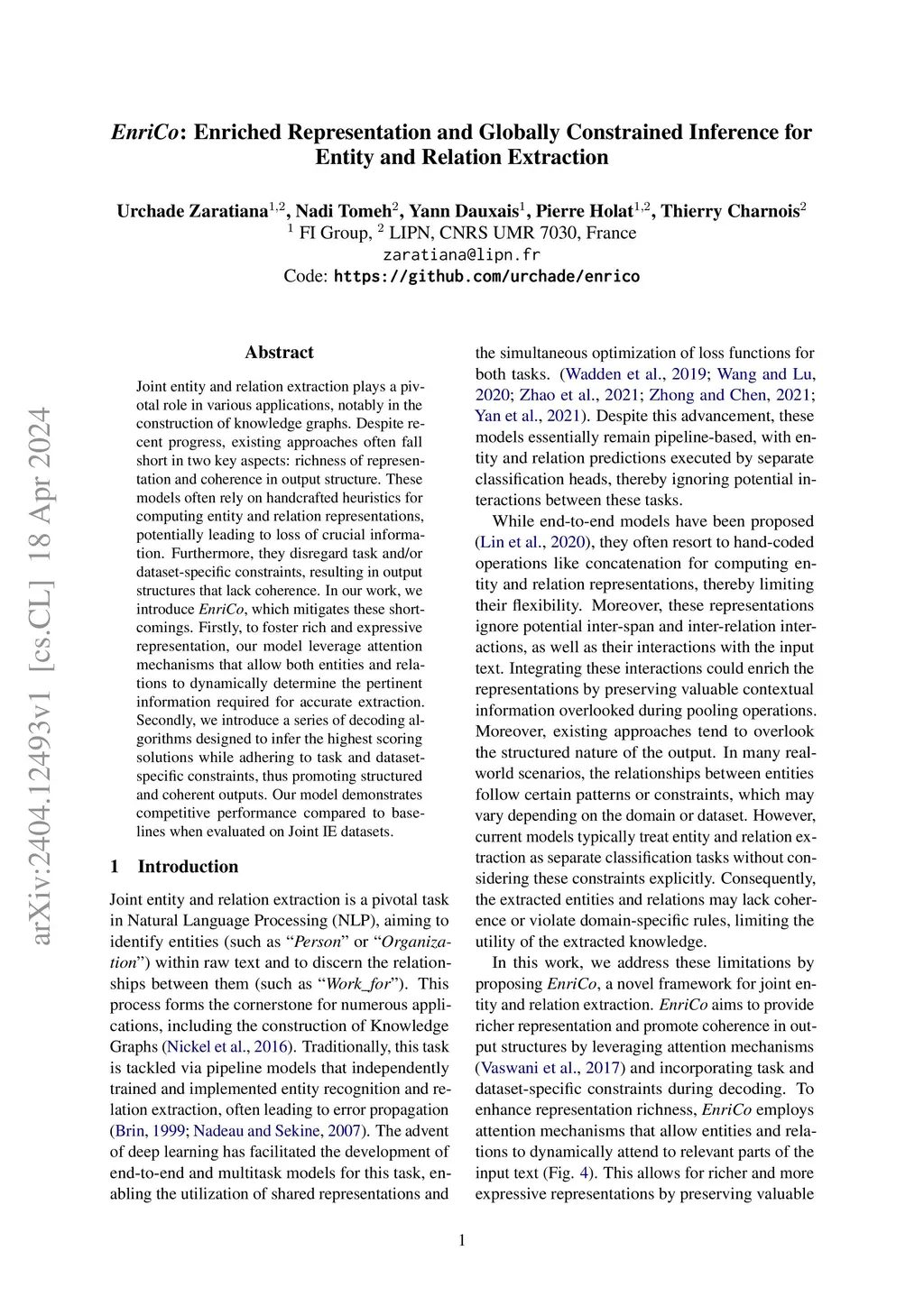 Joint entity and relation extraction plays a pivotal role in various applications, notably in the construction of knowledge graphs. Despite recent progress, existing approaches often fall short in two key aspects: richness of representation and coherence in output structure. These models often rely on handcrafted heuristics for computing entity and relation representations, potentially leading to loss of crucial information. Furthermore, they disregard task and/or dataset-specific constraints, resulting in output structures that lack coherence. In our work, we introduce EnriCo, which mitigates these shortcomings. Firstly, to foster rich and expressive representation, our model leverage attention mechanisms that allow both entities and relations to dynamically determine the pertinent information required for accurate extraction. Secondly, we introduce a series of decoding algorithms designed to infer the highest scoring solutions while adhering to task and dataset-specific constraints, thus promoting structured and coherent outputs. Our model demonstrates competitive performance compared to baselines when evaluated on Joint IE datasets.