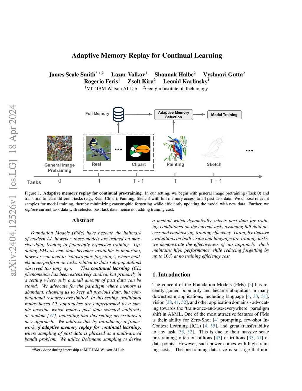 Foundation Models (FMs) have become the hallmark of modern AI, however, these models are trained on massive data, leading to financially expensive training. Updating FMs as new data becomes available is important, however, can lead to `catastrophic forgetting', where models underperform on tasks related to data sub-populations observed too long ago. This continual learning (CL) phenomenon has been extensively studied, but primarily in a setting where only a small amount of past data can be stored. We advocate for the paradigm where memory is abundant, allowing us to keep all previous data, but computational resources are limited. In this setting, traditional replay-based CL approaches are outperformed by a simple baseline which replays past data selected uniformly at random, indicating that this setting necessitates a new approach. We address this by introducing a framework of adaptive memory replay for continual learning, where sampling of past data is phrased as a multi-armed bandit problem. We utilize Bolzmann sampling to derive a method which dynamically selects past data for training conditioned on the current task, assuming full data access and emphasizing training efficiency. Through extensive evaluations on both vision and language pre-training tasks, we demonstrate the effectiveness of our approach, which maintains high performance while reducing forgetting by up to 10% at no training efficiency cost.