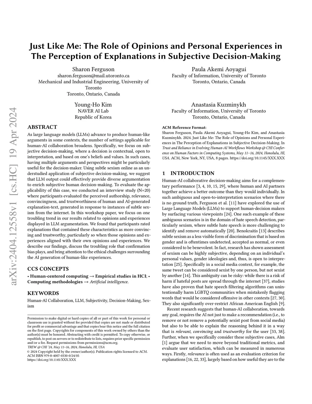As large language models (LLMs) advance to produce human-like arguments in some contexts, the number of settings applicable for human-AI collaboration broadens. Specifically, we focus on subjective decision-making, where a decision is contextual, open to interpretation, and based on one's beliefs and values. In such cases, having multiple arguments and perspectives might be particularly useful for the decision-maker. Using subtle sexism online as an understudied application of subjective decision-making, we suggest that LLM output could effectively provide diverse argumentation to enrich subjective human decision-making. To evaluate the applicability of this case, we conducted an interview study (N=20) where participants evaluated the perceived authorship, relevance, convincingness, and trustworthiness of human and AI-generated explanation-text, generated in response to instances of subtle sexism from the internet. In this workshop paper, we focus on one troubling trend in our results related to opinions and experiences displayed in LLM argumentation. We found that participants rated explanations that contained these characteristics as more convincing and trustworthy, particularly so when those opinions and experiences aligned with their own opinions and experiences. We describe our findings, discuss the troubling role that confirmation bias plays, and bring attention to the ethical challenges surrounding the AI generation of human-like experiences.