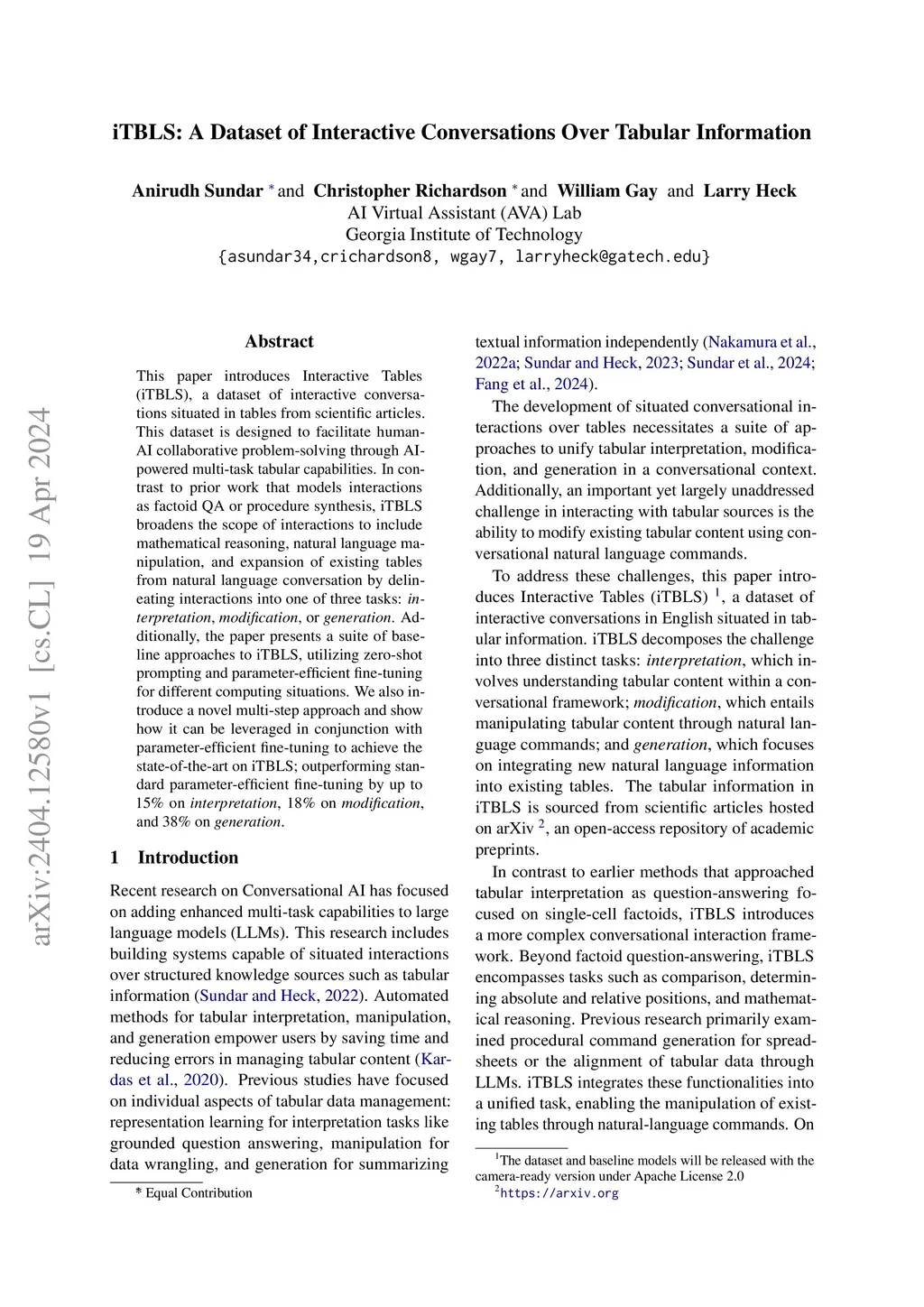 This paper introduces Interactive Tables (iTBLS), a dataset of interactive conversations that focuses on natural-language manipulation of tabular information sourced from academic pre-prints on ArXiv. The iTBLS dataset consists of three types of tabular tasks -- interpretation, modification, and generation. Interpretation focuses on tabular understanding, modification focuses on manipulating tabular information, and generation focuses on the addition of new natural-language evidence. In addition, the paper presents a novel framework that reformulates tabular operations as question-answering, where an appropriate question is formulated based on the nature of interaction and the question is answered using the user request as evidence. The developed approach results in an improvement on all tasks on a sequence-to-sequence modeling baseline on iTBLS. In addition, the question-answering-based reformulation is applied to datasets from prior work for the text-to-table task where textual paragraphs are summarized into tables. The novel approach results in up to 13% improvement in Exact-Match accuracy and up to 16% improvement in BERTScores compared to the prior state-of-the-art.