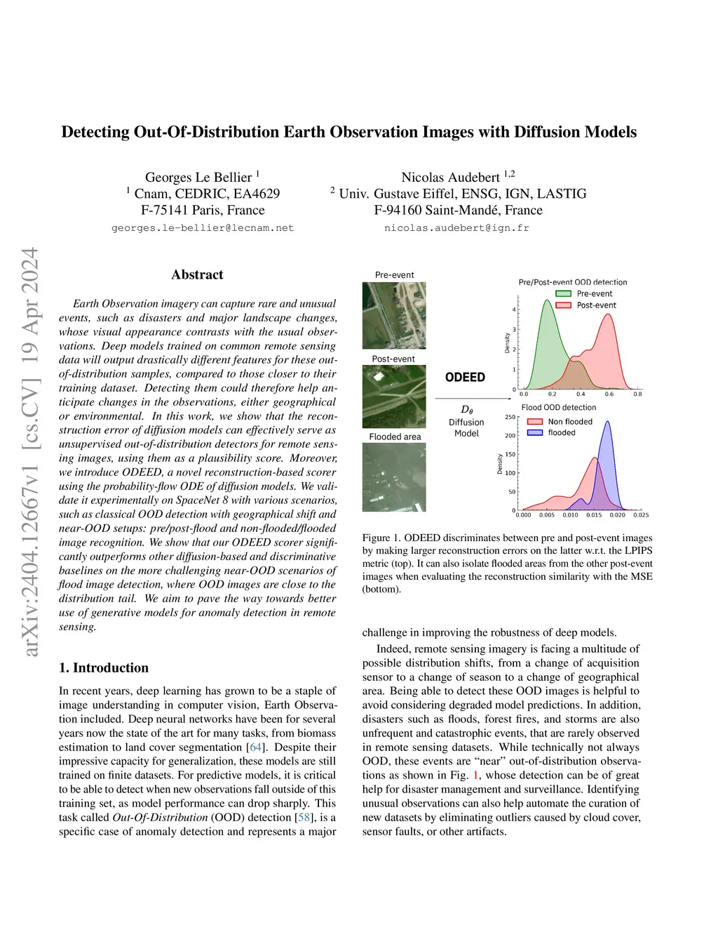 Earth Observation imagery can capture rare and unusual events, such as disasters and major landscape changes, whose visual appearance contrasts with the usual observations. Deep models trained on common remote sensing data will output drastically different features for these out-of-distribution samples, compared to those closer to their training dataset. Detecting them could therefore help anticipate changes in the observations, either geographical or environmental. In this work, we show that the reconstruction error of diffusion models can effectively serve as unsupervised out-of-distribution detectors for remote sensing images, using them as a plausibility score. Moreover, we introduce ODEED, a novel reconstruction-based scorer using the probability-flow ODE of diffusion models. We validate it experimentally on SpaceNet 8 with various scenarios, such as classical OOD detection with geographical shift and near-OOD setups: pre/post-flood and non-flooded/flooded image recognition. We show that our ODEED scorer significantly outperforms other diffusion-based and discriminative baselines on the more challenging near-OOD scenarios of flood image detection, where OOD images are close to the distribution tail. We aim to pave the way towards better use of generative models for anomaly detection in remote sensing.