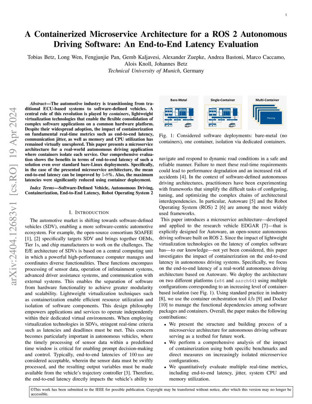 The automotive industry is transitioning from traditional ECU-based systems to software-defined vehicles. A central role of this revolution is played by containers, lightweight virtualization technologies that enable the flexible consolidation of complex software applications on a common hardware platform. Despite their widespread adoption, the impact of containerization on fundamental real-time metrics such as end-to-end latency, communication jitter, as well as memory and CPU utilization has remained virtually unexplored. This paper presents a microservice architecture for a real-world autonomous driving application where containers isolate each service. Our comprehensive evaluation shows the benefits in terms of end-to-end latency of such a solution even over standard bare-Linux deployments. Specifically, in the case of the presented microservice architecture, the mean end-to-end latency can be improved by 5-8 %. Also, the maximum latencies were significantly reduced using container deployment.
