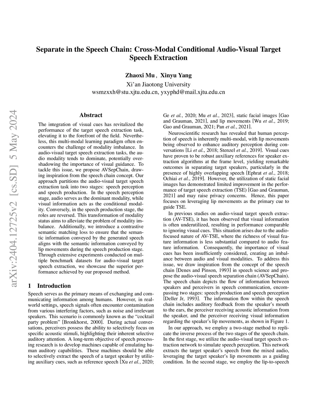 The integration of visual cues has revitalized the performance of the target speech extraction task, elevating it to the forefront of the field. Nevertheless, this multi-modal learning paradigm often encounters the challenge of modality imbalance. In audio-visual target speech extraction tasks, the audio modality tends to dominate, potentially overshadowing the importance of visual guidance. To tackle this issue, we propose AVSepChain, drawing inspiration from the speech chain concept. Our approach partitions the audio-visual target speech extraction task into two stages: speech perception and speech production. In the speech perception stage, audio serves as the dominant modality, while visual information acts as the conditional modality. Conversely, in the speech production stage, the roles are reversed. This transformation of modality status aims to alleviate the problem of modality imbalance. Additionally, we introduce a contrastive semantic matching loss to ensure that the semantic information conveyed by the generated speech aligns with the semantic information conveyed by lip movements during the speech production stage. Through extensive experiments conducted on multiple benchmark datasets for audio-visual target speech extraction, we showcase the superior performance achieved by our proposed method.