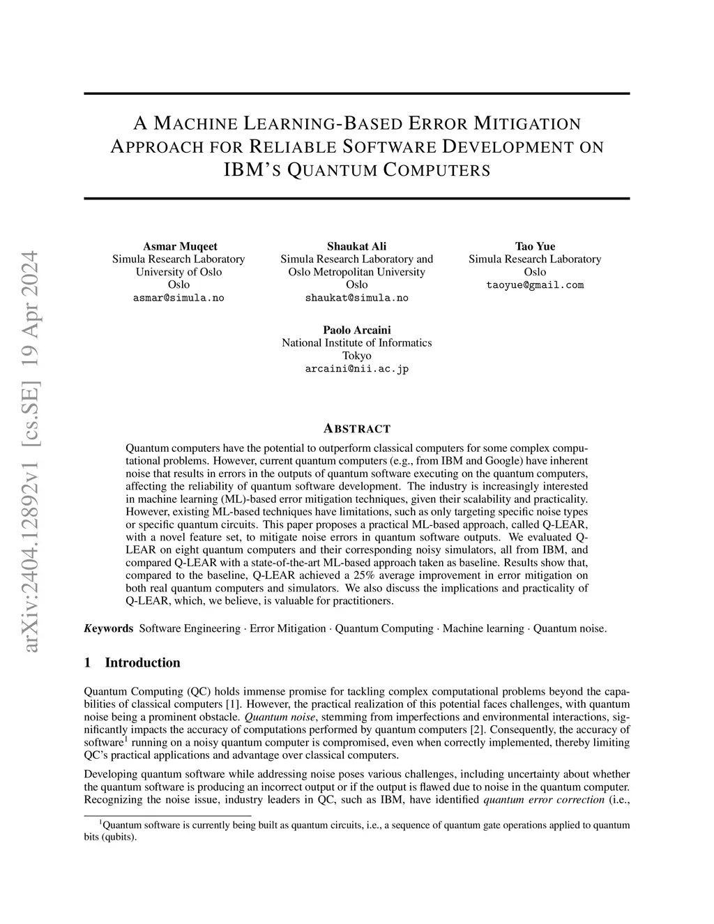 Quantum computers have the potential to outperform classical computers for some complex computational problems. However, current quantum computers (e.g., from IBM and Google) have inherent noise that results in errors in the outputs of quantum software executing on the quantum computers, affecting the reliability of quantum software development. The industry is increasingly interested in machine learning (ML)--based error mitigation techniques, given their scalability and practicality. However, existing ML-based techniques have limitations, such as only targeting specific noise types or specific quantum circuits. This paper proposes a practical ML-based approach, called Q-LEAR, with a novel feature set, to mitigate noise errors in quantum software outputs. We evaluated Q-LEAR on eight quantum computers and their corresponding noisy simulators, all from IBM, and compared Q-LEAR with a state-of-the-art ML-based approach taken as baseline. Results show that, compared to the baseline, Q-LEAR achieved a 25% average improvement in error mitigation on both real quantum computers and simulators. We also discuss the implications and practicality of Q-LEAR, which, we believe, is valuable for practitioners.