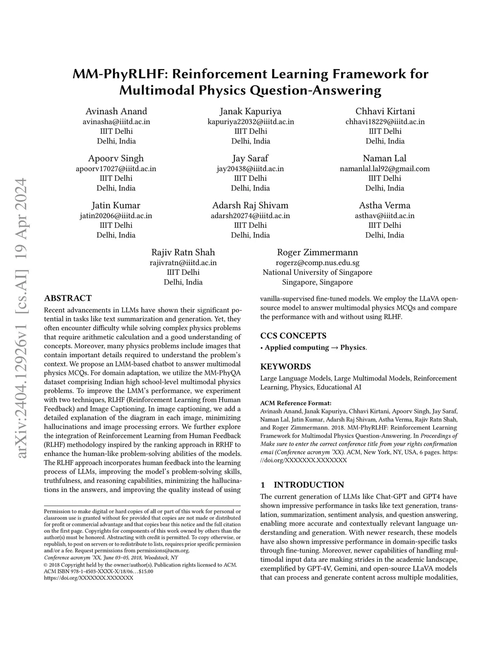 Recent advancements in LLMs have shown their significant potential in tasks like text summarization and generation. Yet, they often encounter difficulty while solving complex physics problems that require arithmetic calculation and a good understanding of concepts. Moreover, many physics problems include images that contain important details required to understand the problem's context. We propose an LMM-based chatbot to answer multimodal physics MCQs. For domain adaptation, we utilize the MM-PhyQA dataset comprising Indian high school-level multimodal physics problems. To improve the LMM's performance, we experiment with two techniques, RLHF (Reinforcement Learning from Human Feedback) and Image Captioning. In image captioning, we add a detailed explanation of the diagram in each image, minimizing hallucinations and image processing errors. We further explore the integration of Reinforcement Learning from Human Feedback (RLHF) methodology inspired by the ranking approach in RLHF to enhance the human-like problem-solving abilities of the models. The RLHF approach incorporates human feedback into the learning process of LLMs, improving the model's problem-solving skills, truthfulness, and reasoning capabilities, minimizing the hallucinations in the answers, and improving the quality instead of using vanilla-supervised fine-tuned models. We employ the LLaVA open-source model to answer multimodal physics MCQs and compare the performance with and without using RLHF.