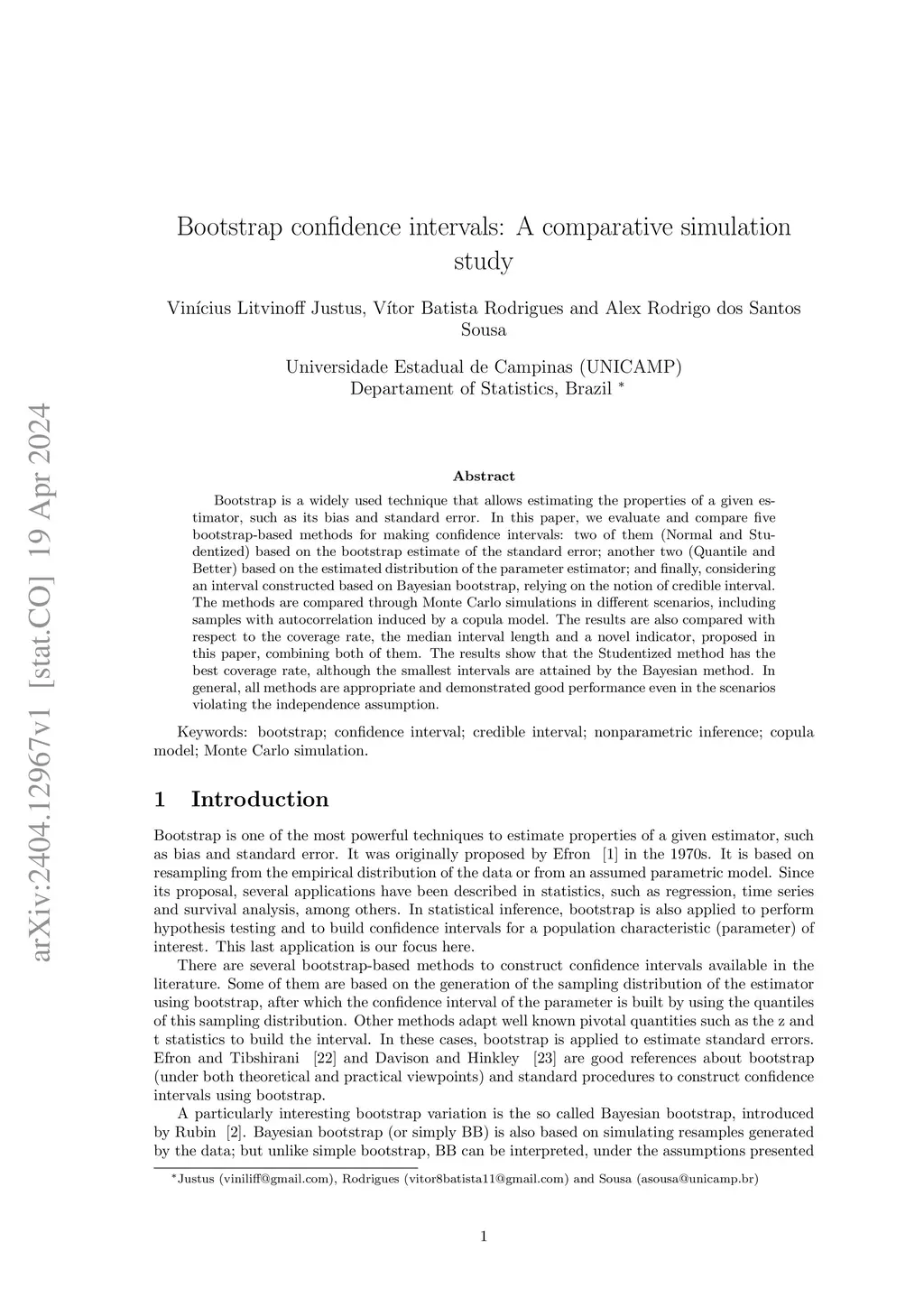 Bootstrap is a widely used technique that allows estimating the properties of a given estimator, such as its bias and standard error. In this paper, we evaluate and compare five bootstrap-based methods for making confidence intervals: two of them (Normal and Studentized) based on the bootstrap estimate of the standard error; another two (Quantile and Better) based on the estimated distribution of the parameter estimator; and finally, considering an interval constructed based on Bayesian bootstrap, relying on the notion of credible interval. The methods are compared through Monte Carlo simulations in different scenarios, including samples with autocorrelation induced by a copula model. The results are also compared with respect to the coverage rate, the median interval length and a novel indicator, proposed in this paper, combining both of them. The results show that the Studentized method has the best coverage rate, although the smallest intervals are attained by the Bayesian method. In general, all methods are appropriate and demonstrated good performance even in the scenarios violating the independence assumption.
