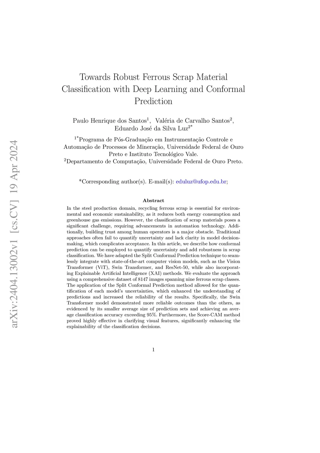 In the steel production domain, recycling ferrous scrap is essential for environmental and economic sustainability, as it reduces both energy consumption and greenhouse gas emissions. However, the classification of scrap materials poses a significant challenge, requiring advancements in automation technology. Additionally, building trust among human operators is a major obstacle. Traditional approaches often fail to quantify uncertainty and lack clarity in model decision-making, which complicates acceptance. In this article, we describe how conformal prediction can be employed to quantify uncertainty and add robustness in scrap classification. We have adapted the Split Conformal Prediction technique to seamlessly integrate with state-of-the-art computer vision models, such as the Vision Transformer (ViT), Swin Transformer, and ResNet-50, while also incorporating Explainable Artificial Intelligence (XAI) methods. We evaluate the approach using a comprehensive dataset of 8147 images spanning nine ferrous scrap classes. The application of the Split Conformal Prediction method allowed for the quantification of each model's uncertainties, which enhanced the understanding of predictions and increased the reliability of the results. Specifically, the Swin Transformer model demonstrated more reliable outcomes than the others, as evidenced by its smaller average size of prediction sets and achieving an average classification accuracy exceeding 95%. Furthermore, the Score-CAM method proved highly effective in clarifying visual features, significantly enhancing the explainability of the classification decisions.