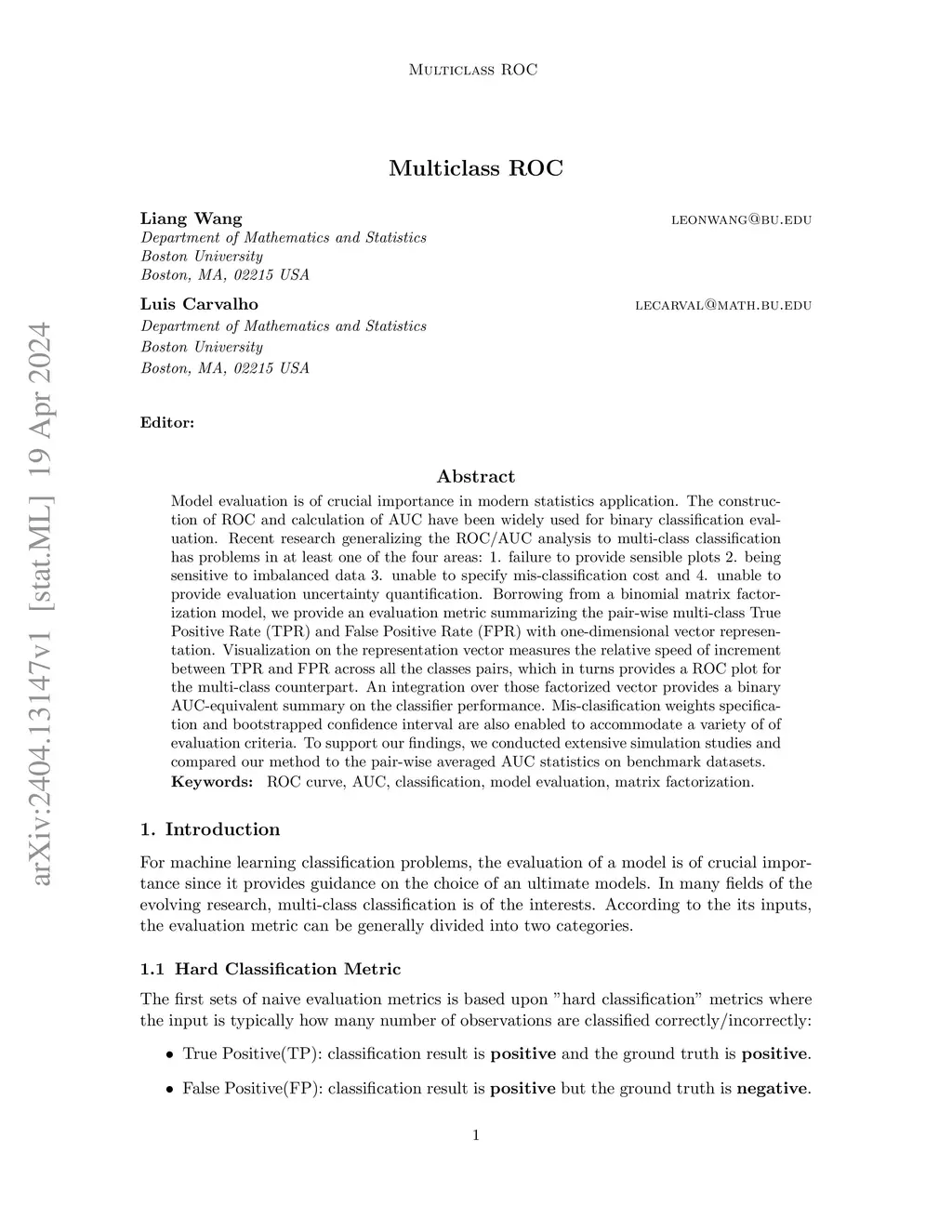 Model evaluation is of crucial importance in modern statistics application. The construction of ROC and calculation of AUC have been widely used for binary classification evaluation. Recent research generalizing the ROC/AUC analysis to multi-class classification has problems in at least one of the four areas: 1. failure to provide sensible plots 2. being sensitive to imbalanced data 3. unable to specify mis-classification cost and 4. unable to provide evaluation uncertainty quantification. Borrowing from a binomial matrix factorization model, we provide an evaluation metric summarizing the pair-wise multi-class True Positive Rate (TPR) and False Positive Rate (FPR) with one-dimensional vector representation. Visualization on the representation vector measures the relative speed of increment between TPR and FPR across all the classes pairs, which in turns provides a ROC plot for the multi-class counterpart. An integration over those factorized vector provides a binary AUC-equivalent summary on the classifier performance. Mis-clasification weights specification and bootstrapped confidence interval are also enabled to accommodate a variety of of evaluation criteria. To support our findings, we conducted extensive simulation studies and compared our method to the pair-wise averaged AUC statistics on benchmark datasets.